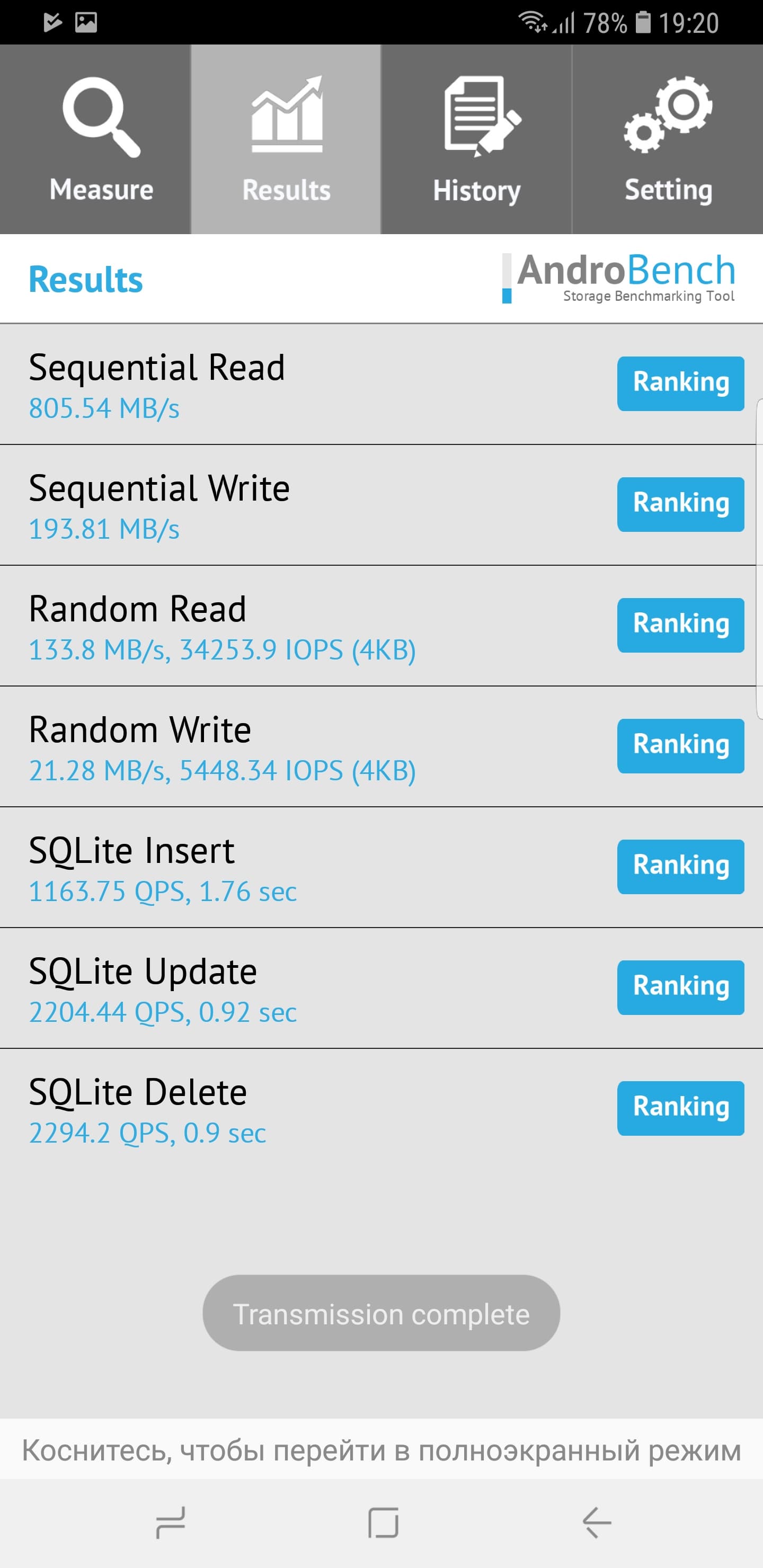 Результаты теста AndroBench на скорость работы с памятью: