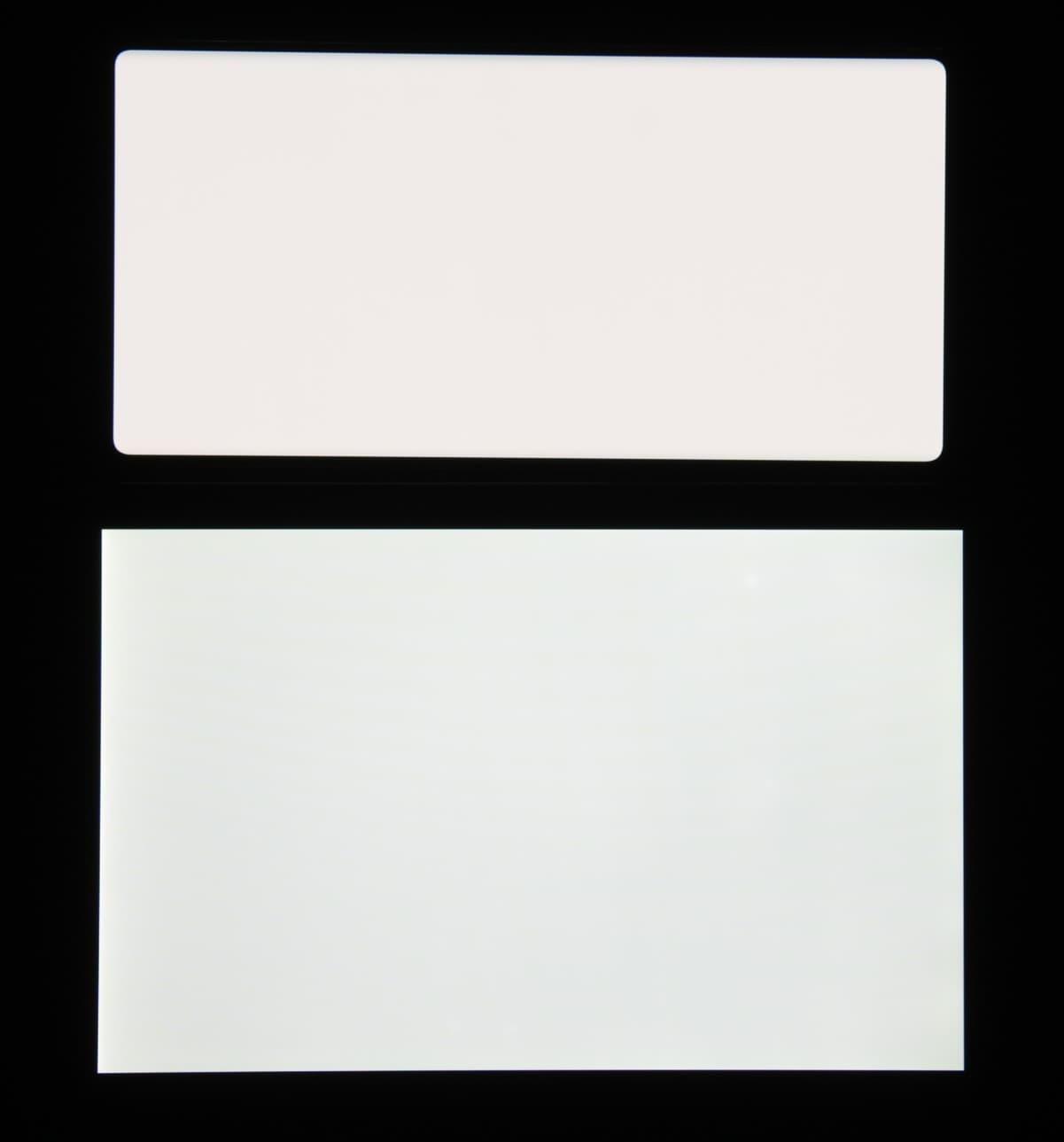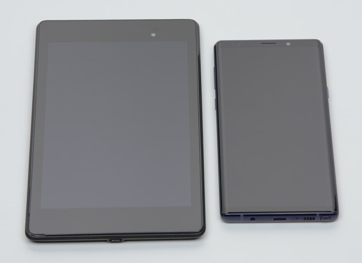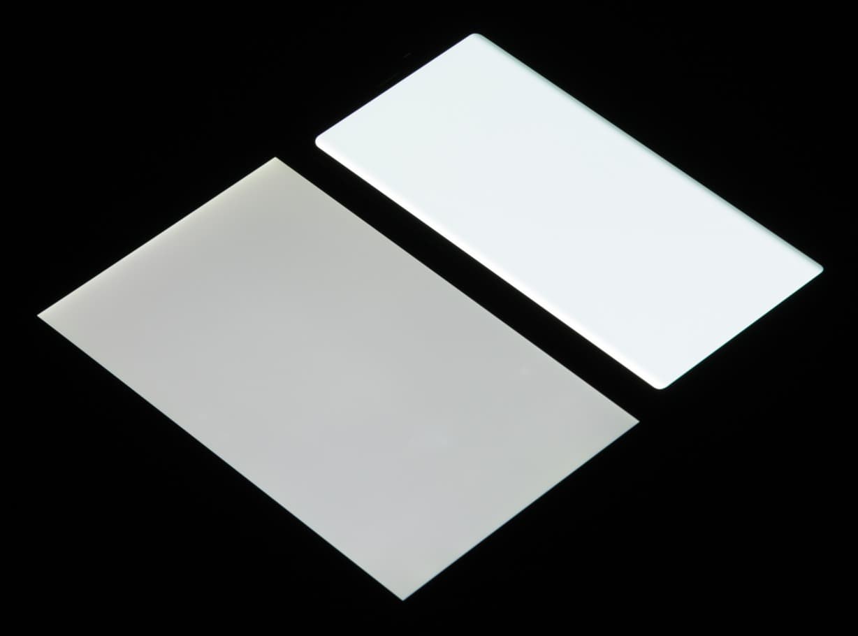 Лицевая поверхность экрана выполнена в виде стеклянной пластины с зеркально-гладкой поверхностью, устойчивой к появлению царапин. Судя по отражению объектов, антибликовые свойства экрана лучше, чем у экрана Google Nexus 7 (2013) (далее просто Nexus 7). Для наглядности приведем фотографию, на которой в выключенных экранах отражается белая поверхность (слева — Nexus 7, справа — Samsung Galaxy Note 9, далее их можно различать по размеру):