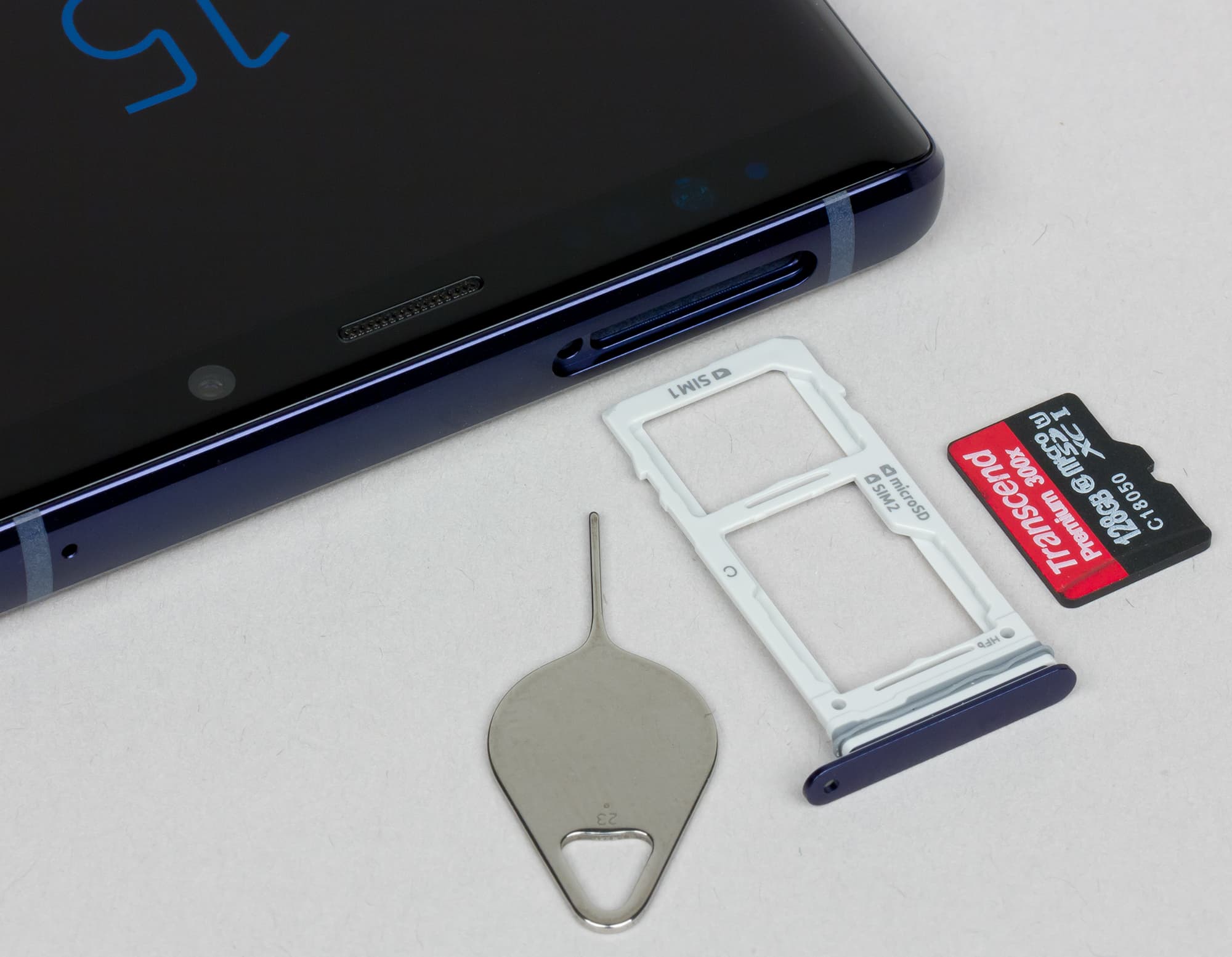 Разъем для двух карт формата Nano-SIM и карты памяти установили на верхнем торце и сделали гибридным (карту microSD можно поставить только вместо одной из SIM-карт). Поддерживается горячая замена карточек.