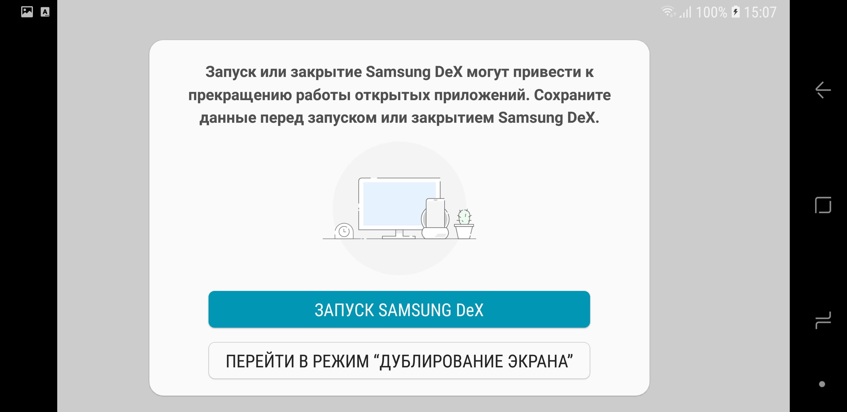 Отметим, что в данном случае для работы в режиме Samsung DeX не обязательно использовать фирменный адаптер. На экран монитора выводится изображение альтернативного рабочего стола, а экран смартфона может использоваться в качестве сенсорной панели координатного ввода или работать как обычно. На рабочем столе DeX могут работать большинство приложений Android.