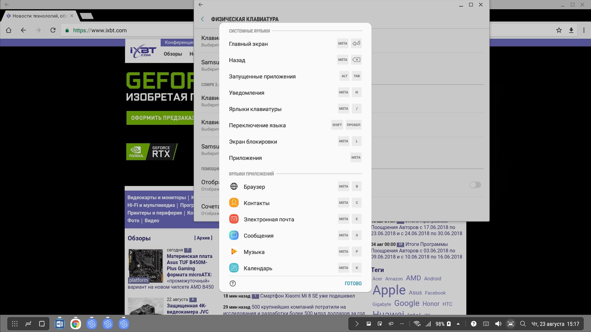 Управляющая панель в нижней части экрана убирается при выводе изображения на весь экран (например, при воспроизведении видео). Вывод на монитор осуществляется в истинном разрешении 1920 на 1080 пикселей и точка в точку. Отметим, что одновременно с выводом изображения и звука можно по USB или по Bluetooth подключать к смартфону мышь и клавиатуру, превращая его в основу для рабочего места. Кроме того, читаются подключенные к адаптеру USB-накопители и карты памяти. Для физической клавиатуры поддерживаются переключение языка и ряд горячих сочетаний клавиш (клавиша Meta — это, видимо, клавиша Win на клавиатуре ПК).