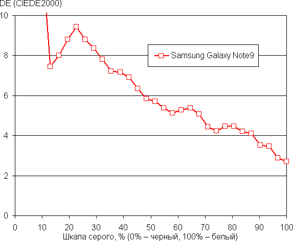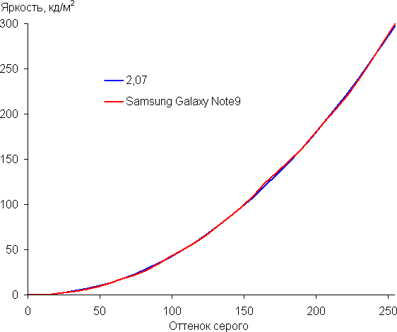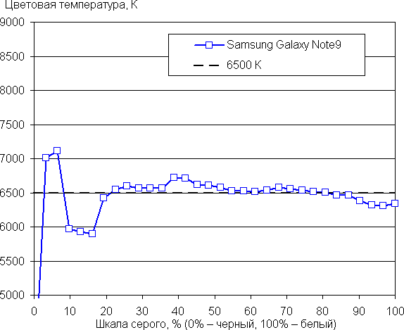 Напомним, что в случае OLED-экранов яркость фрагментов изображения динамично меняется в соответствии с характером выводимого изображения — уменьшается для светлых в целом изображений. В итоге полученная зависимость яркости от оттенка (гамма-кривая), скорее всего, немного не соответствует гамма-кривой статичного изображения, так как измерения проводились при последовательном выводе оттенков серого почти на весь экран.