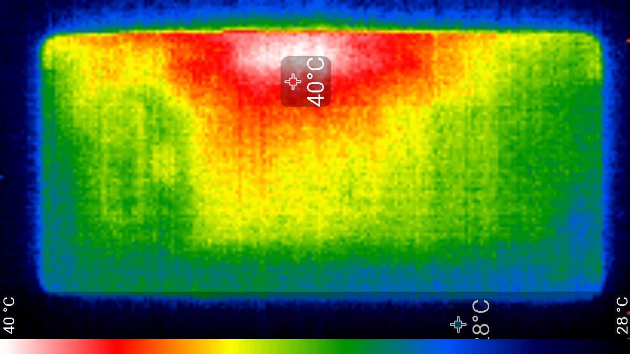 Нагрев сильно локализован примерно по центру по вертикали и близко к левому краю, что, видимо, соответствует расположению микросхемы SoC. По данным теплокамеры, максимальный нагрев составил 40 градусов (при температуре окружающего воздуха в 24 градуса), это средний нагрев в данном тесте для современных смартфонов.