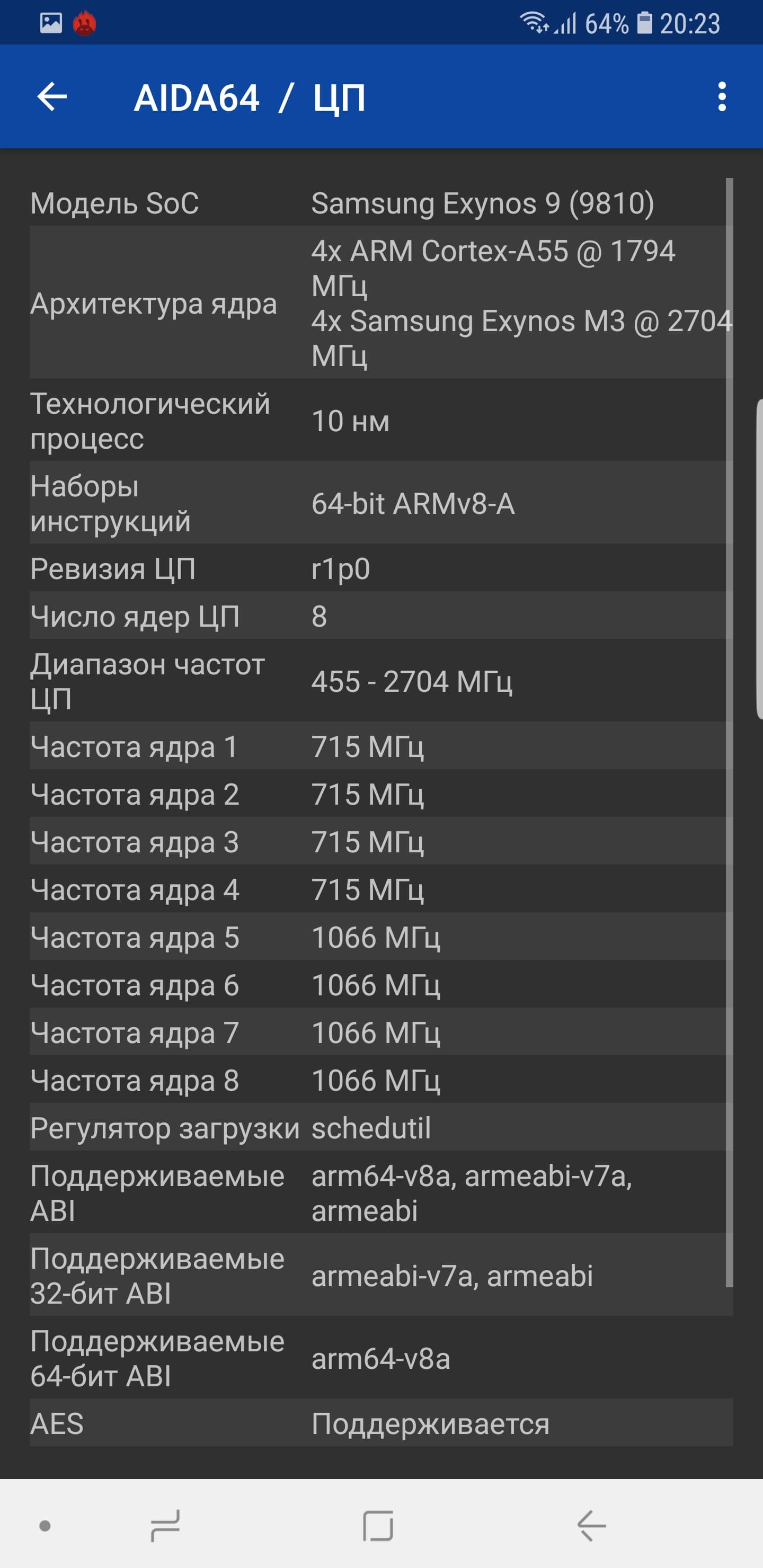 - SoC Samsung Exynos 9810, 8 ядер (4×Exynos M3 @2,7 ГГц + 4×Cortex-A55 @1,8 ГГц)