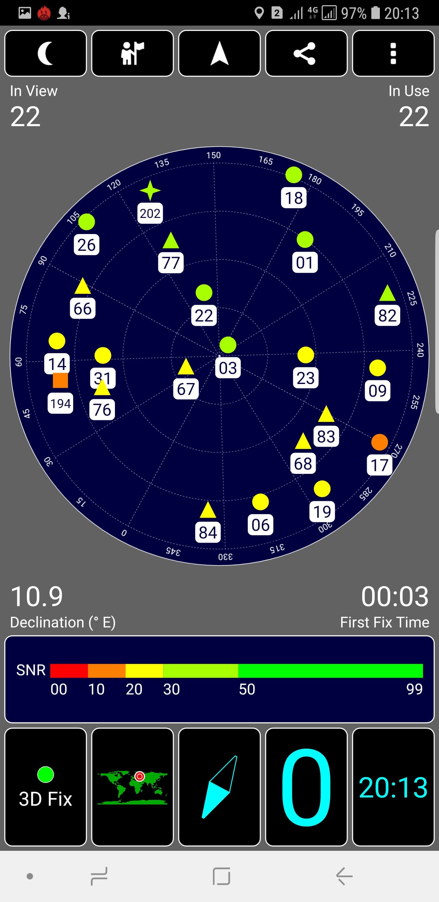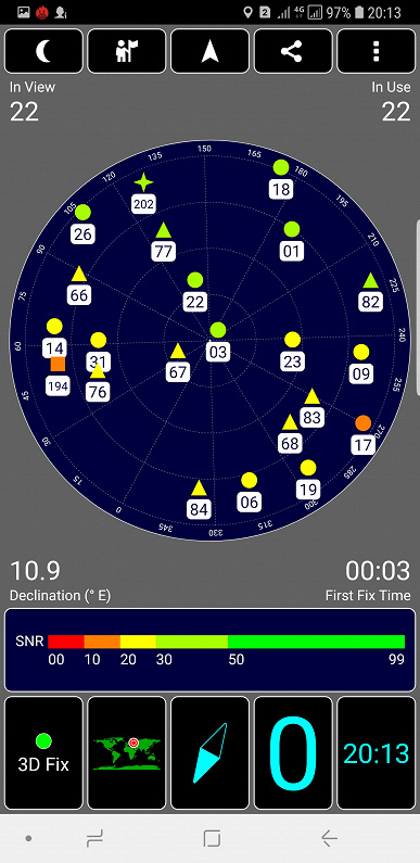 Навигационный модуль работает со всеми современными системами спутниковой навигации, включая даже Galileo (в том числе, конечно, с GPS и с отечественной Глонасс). Первые спутники даже при холодном старте обнаруживаются быстро, в течение первых же секунд, точность позиционирования не вызывает претензий. Магнитный компас, необходимый для навигационных программ, в смартфоне установлен.