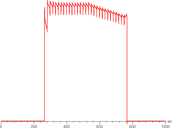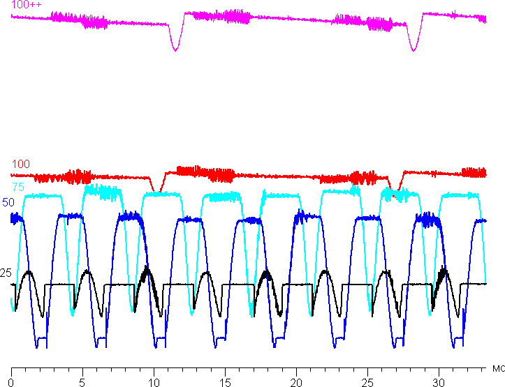 Видно, что на максимальной (как «100++» мы обозначили режим с дополнительной засветкой датчика освещенности ярким светом) и близкой к ней яркости амплитуда модуляции не очень большая, в итоге видимого мерцания нет. Однако при понижении яркости появляется модуляция с большой относительной амплитудой, ее наличие уже можно увидеть в тесте на присутствие стробоскопического эффекта или просто при быстром движении глаз. В зависимости от индивидуальной чувствительности такое мерцание может вызывать повышенную утомляемость. Отметим, что на очень низкой яркости, например на 25%, характер модуляции меняется: появляется П-образный участок, также меняется амплитуда модуляции, и мерцание становится чуть менее заметным.