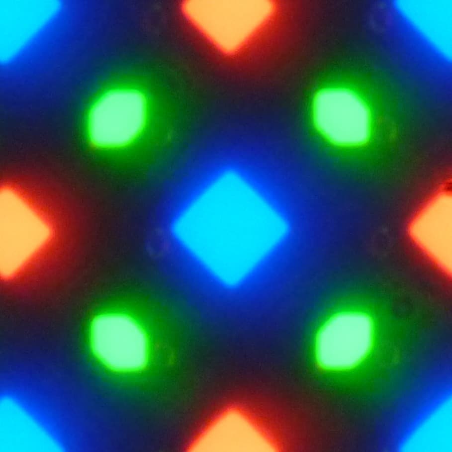 В этом экране используется матрица Super AMOLED — активная матрица на органических светодиодах. Полноцветное изображение создается с помощью субпикселей трех цветов — красного (R), зеленого (G) и синего (B), но красных и синих субпикселей в два раза меньше, что можно обозначить как RGBG. Это подтверждается фрагментом микрофотографии:
