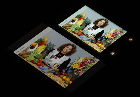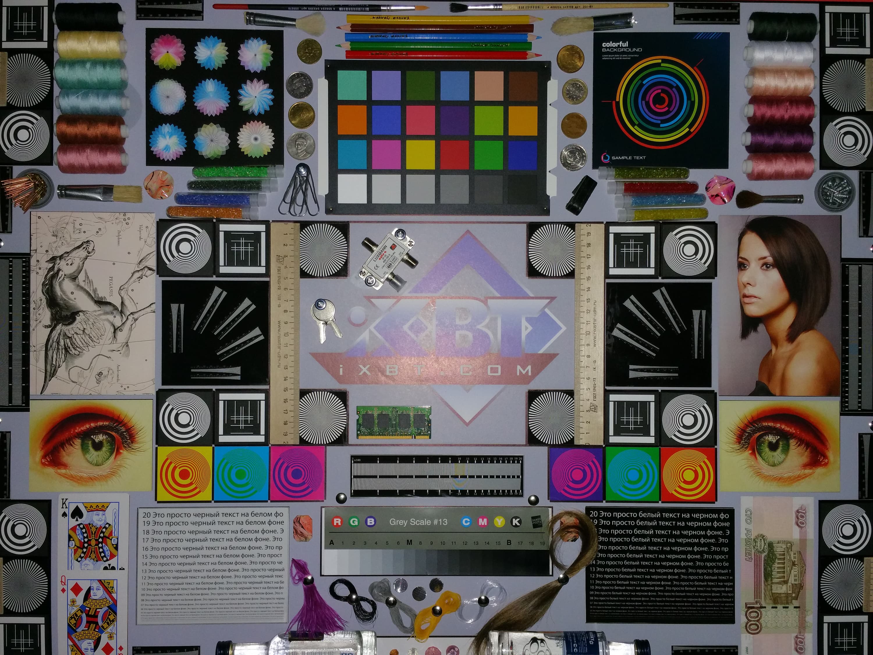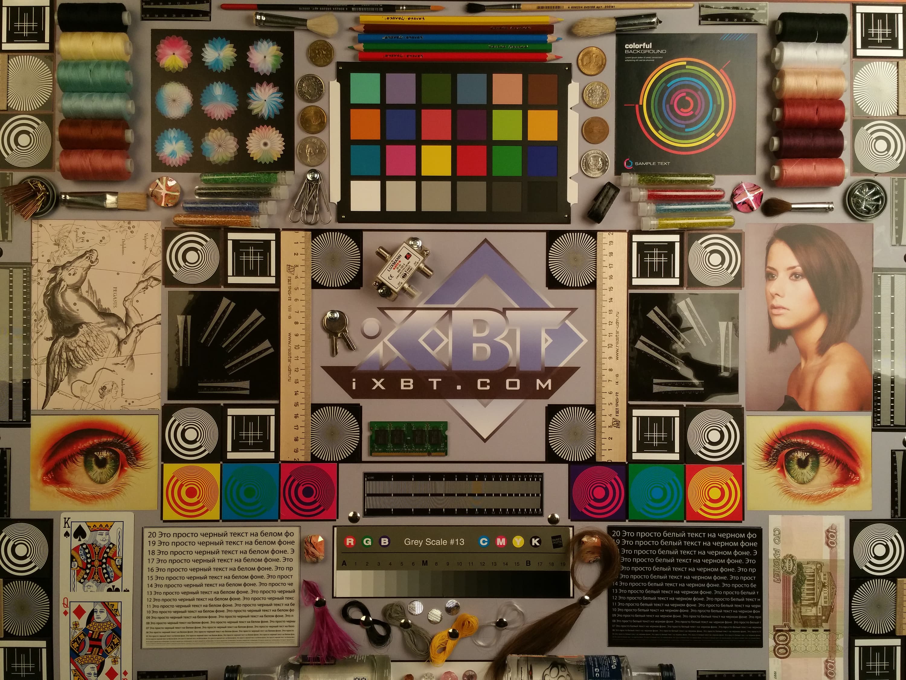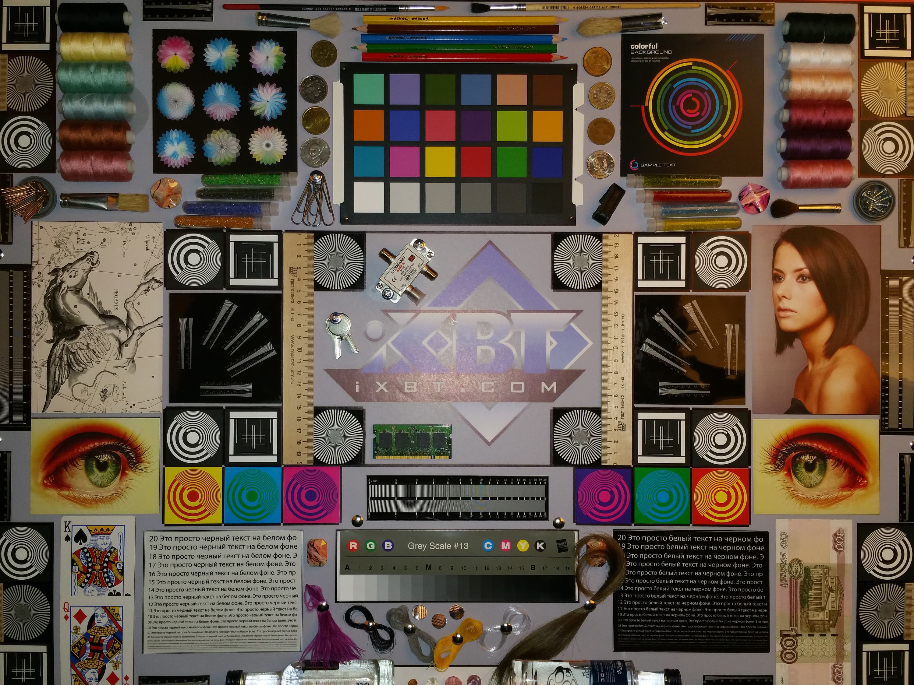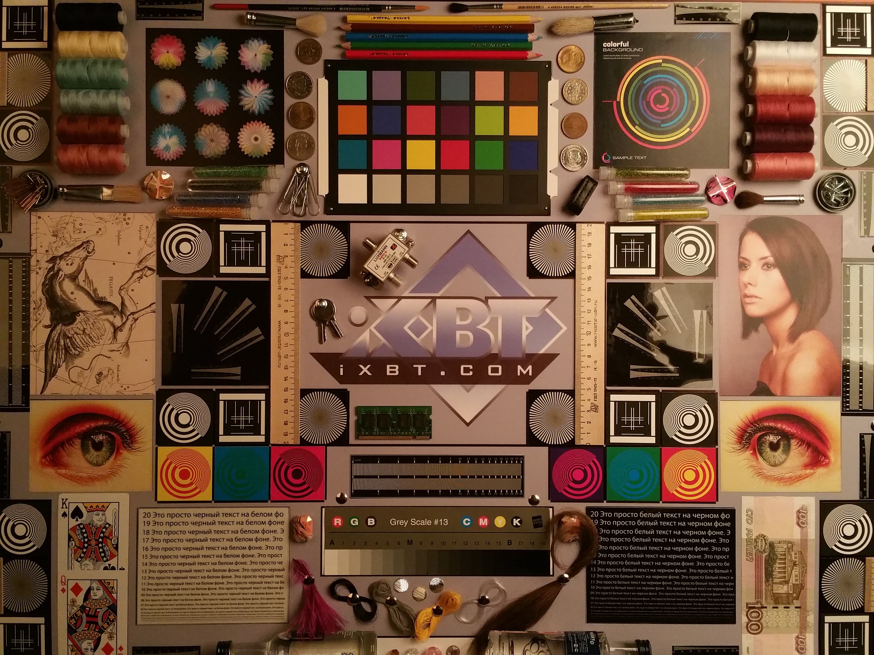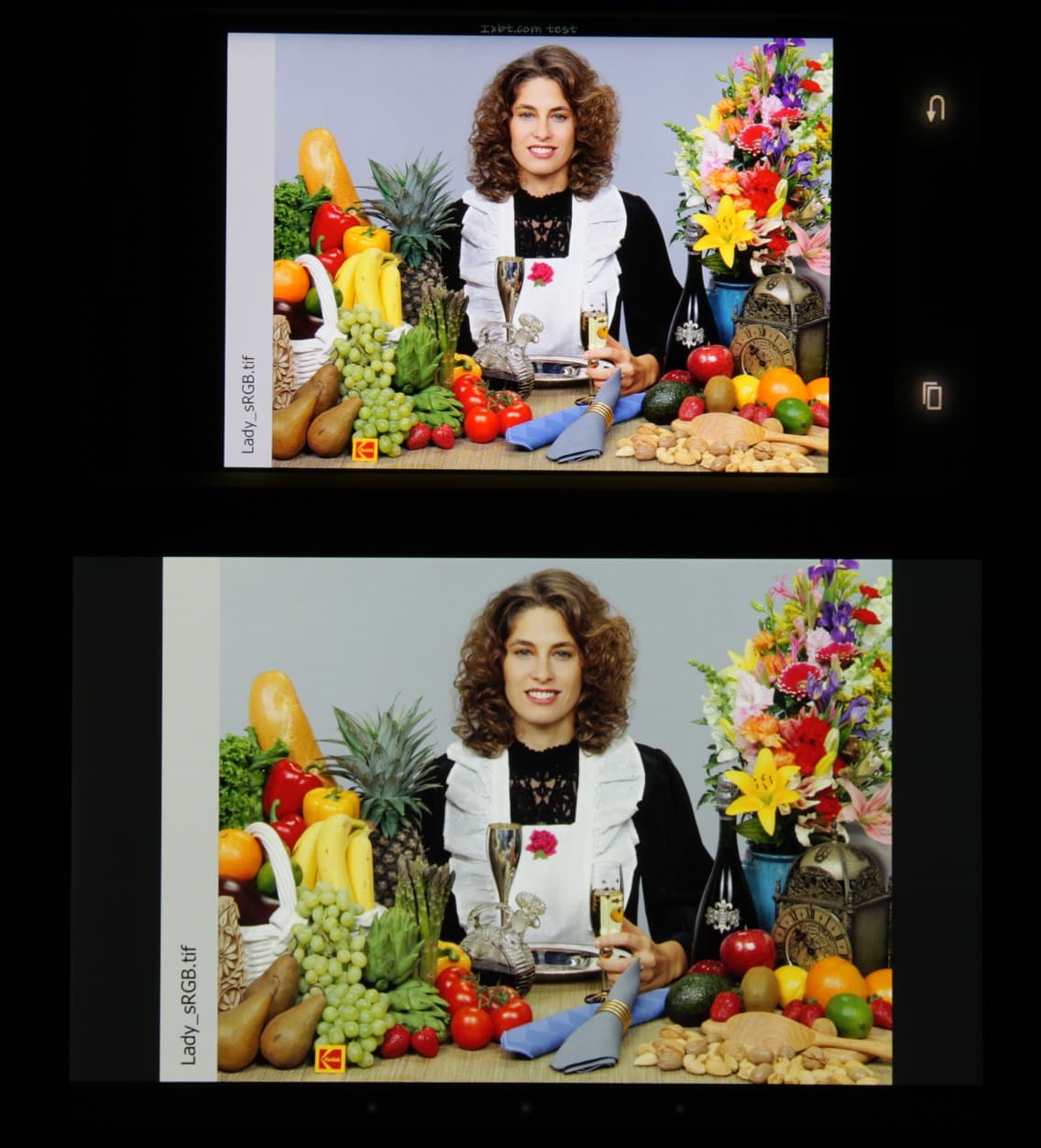 Яркость под углом у обоих экранов заметно уменьшилась (чтобы избежать сильного затемнения, выдержка увеличена в 2,6 раза в сравнении с предыдущими двумя фотографиями), но в случае Samsung падение яркости выражено гораздо меньше (затемнение на загибе можно не учитывать). В итоге при формально одинаковой яркости экран Galaxy Note Edge визуально выглядит гораздо более ярким (в сравнении с ЖК-экранами), так как на экран мобильного устройства часто приходится смотреть как минимум под небольшим углом. И тестовая картинка: