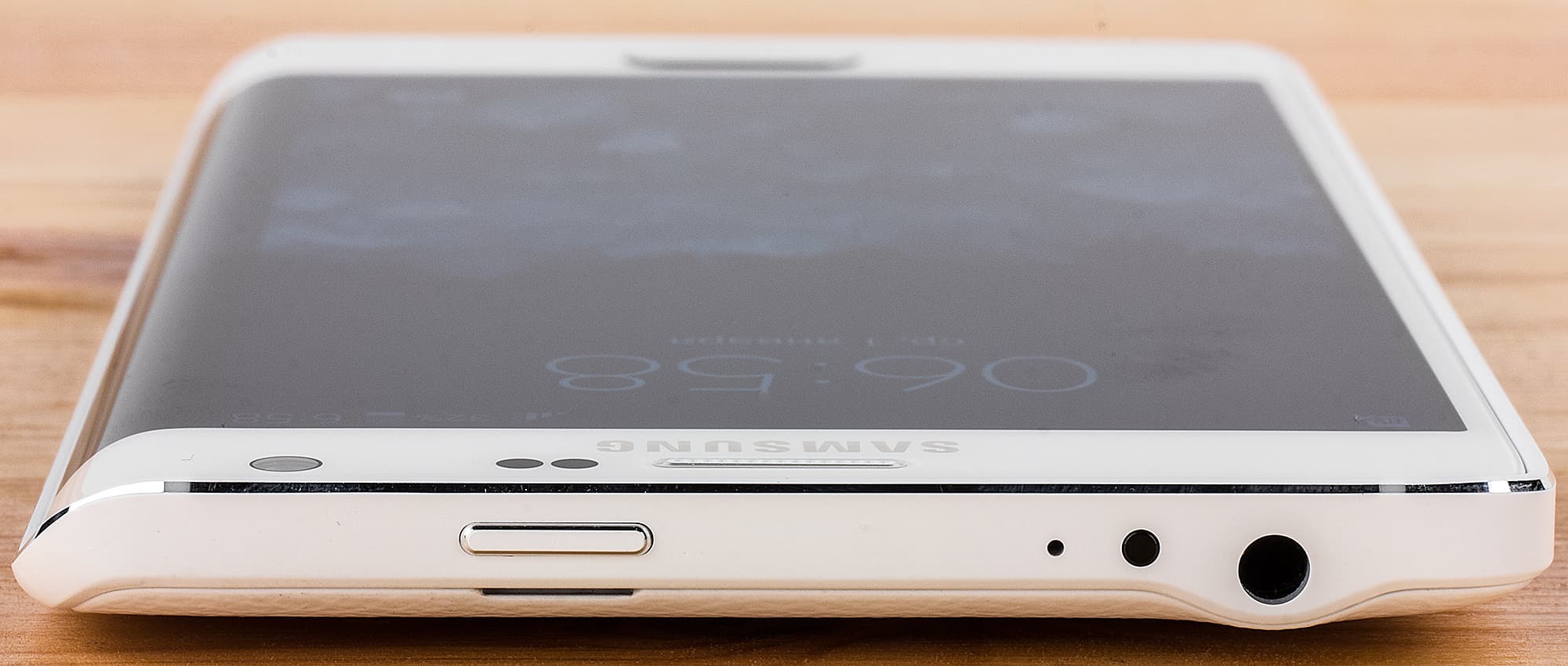 Теперь посмотрим на грани устройства. На верхней грани мы видим кнопку питания, разъем 3,5 мм для подключения гарнитуры, ИК-порт и отверстие микрофона. Расположение кнопки питания — одно из главных отличий дизайна Note Edge от Note 4, где эта кнопка располагалась на правой грани. Там, конечно, до нее доставать удобнее. Но у Note Edge правая грань занята закругляющимся экраном, поэтому пришлось вынести кнопку на верхнюю грань.