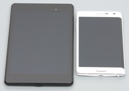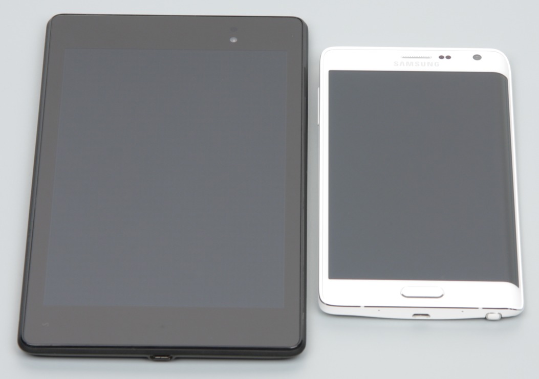Лицевая поверхность экрана выполнена в виде стеклянной пластины с зеркально-гладкой поверхностью, устойчивой к появлению царапин. Судя по отражению объектов, антибликовые свойства экрана может чуть лучше, чем у экрана Google Nexus 7 (2013) (далее просто Nexus 7). Для наглядности приведем фотографию, на которой в выключенных экранах отражается белая поверхность (слева — Nexus 7, справа — Samsung Galaxy Note Edge, далее их можно различать по размеру):