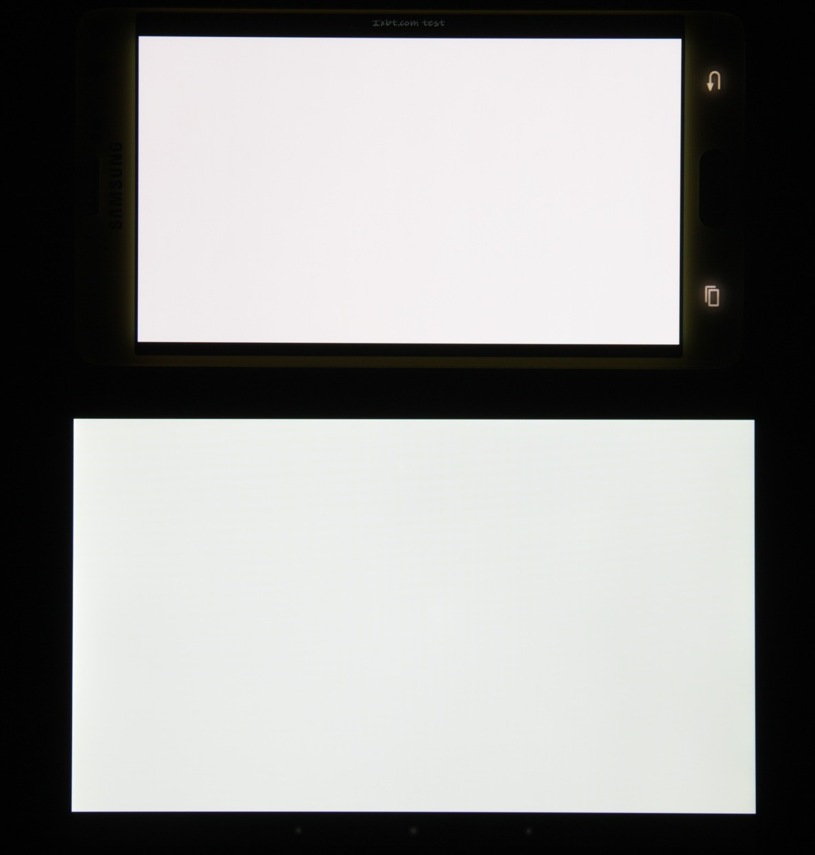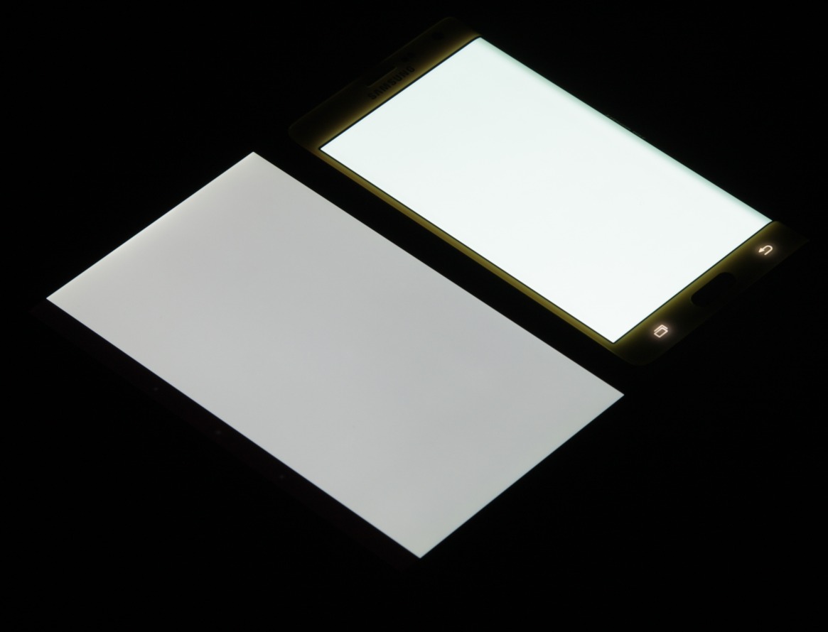Экран характеризуется великолепными углами обзора. Правда, белый цвет при отклонении даже на небольшие углы приобретает легкий сине-зеленый оттенок, но черный цвет остается просто черным под любыми углами. Он настолько черный, что параметр контрастности в данном случае неприменим. При перпендикулярном взгляде равномерность белого поля отличная. Для сравнения приведем фотографии, на которых на экраны Galaxy Note Edge (профиль Основной) и второго участника сравнения выведены одинаковые изображения, при этом яркость экранов изначально установлена примерно на 160 кд/м², а цветовой баланс на фотоаппарате принудительно переключен на 6500 К. Белое поле: