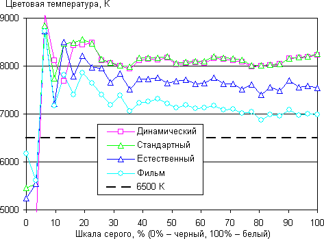 Самый хороший баланс по цветовой температуре достигается при выборе профиля Фильм, при выборе других профилей белый и оттенки серого становятся холоднее, цветовая температура в среднем повышается: