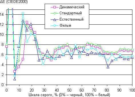 Отклонение от спектра абсолютно черного тела (дельта Е) в среднем меньше 10, что в данном случае очень хорошо (темные области шкалы серого можно не учитывать, так как там баланс цветов не имеет большого значения, да и погрешность измерений на низкой яркости большая):