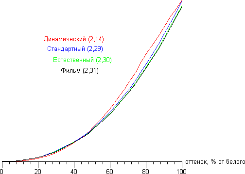 Ценность такой подстройки заключается в некоторой экономии энергии. В данном смартфоне используется матрица HD Super AMOLED — активная матрица на органических светодиодах. Это обусловливает особые свойства: экран имеет очень хорошие углы обзора, а черный цвет настолько черный, что параметр контрастности в данном случае просто неприменим. При перпендикулярном взгляде равномерность белого поля очень хорошая. Переключение состояния элементов матрицы фактически выполняется мгновенно, поэтому время отклика можно приравнять к нулю. Правда, переходы между оттенками в некоторых случаях имеют ступеньку с задержкой примерно на 17 мс, но принципиального значения этот факт не имеет. В настройках свойств экрана можно выбрать один из четырех профилей — Динамический, Стандартный, Естественный и Фильм. Как видно из приведенных ниже данных, цветопередача в этих профилях различается. Так, гамма-кривая профиля Динамический имеет S-образный характер, тогда как в случае остальных профилей она близка к степенной функции с показателем 2,29-2,31 (что не очень отличается от стандартного значения в 2,2):