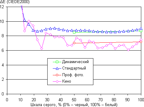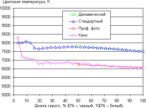 Баланс оттенков на шкале серого неидеальный, но, в общем-то, приемлемый. Цветовая температура в профилях Динамический и Стандартный существенно выше 6500 К, в двух оставшихся — близка к стандартным 6500 К, при этом на участке шкалы серого от белого до темно-серого цвета этот параметр изменяется незначительно. Отклонение от спектра абсолютно черного тела (дельта Е) на большей части шкалы серого остается ниже 10 единиц, что для потребительского устройства считается хорошим показателем, и также изменяется не сильно. (Темные области шкалы серого можно не учитывать, так как там баланс цветов не имеет большого значения, да и погрешность измерений цветовых характеристик на низкой яркости большая.)