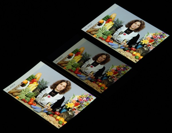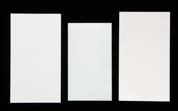 Экран характеризуется хорошими углами обзора, правда белый цвет при отклонении на относительно большие углы приобретает не сильный, но заметный оттенок. Например, так выглядит белое поле при перпендикулярном направлении взгляда к плоскости экрана (слева направо: Samsung Galaxy Round, смартфон с IPS-экраном, Samsung Galaxy Note 3):