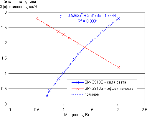 Эффективность Galaxy Round оказалась равной 1,91 кд/Вт, что немного ниже, чем у его практически полных аналогов с плоским экраном. По графикам прослеживается тенденция того, что по мере роста яркости эффективность немного снижается. Убрав результат для самой низкой яркости (явно выпадавший — возможно, из-за влияния побочных процессов), мы смогли с большой точностью аппроксимировать зависимость силы света от мощности полиномом второй степени. Рассчитав алгебраически производную от этого полинома, мы смогли построить зависимость эффективности от яркости (красная линия):