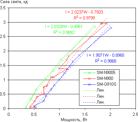 В качестве дополнительного теста мы определили эффективность экрана как источника света в направлении перпендикулярно к плоскости экрана. Для этого мы для различных уровней яркости замеряли яркость экрана и потребляемую мощность. Условия соответствовали предыдущему тесту, при этом во весь экран выводилось белое поле. Построив зависимость силы света (яркости умноженной на площадь экрана) от мощности, по углу наклона аппроксимирующей прямой мы смогли оценить эффективность. Для сравнения приведены результаты и для двух Note 3: