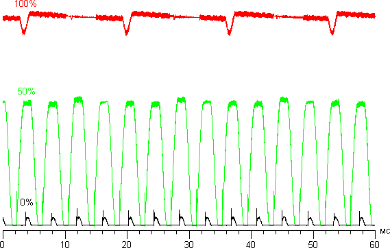 Видно, что на максимальной яркости модуляция фактически отсутствует, поэтому мерцание подсветки увидеть невозможно. Но на низкой и тем более на половинной яркости модуляция имеет относительно большую амплитуду, и в этом случае мерцание можно увидеть — вряд ли просто глядя на экран, но если быстро помахать, например, карандашом перед белым полем на экране, то мерцание будет выявлено по повторяющемуся следу от карандаша.