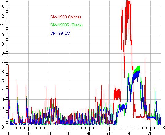 Максимальное потребление у SM-N9005 немного выше, чем у SM-G910S. Однако ток в пике до сглаживания (в данном тесте) в случае SM-N9005 доходил до 2,2 А, тогда как у SM-G910S — до 2,5 А.