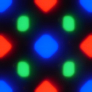 В этом смартфоне используется матрица Super AMOLED — активная матрица на органических светодиодах. Полноцветное изображение создается с помощью субпикселей трех цветов — красного (R), зеленого (G) и синего (B), но зеленых субпикселей в два раза больше, что можно обозначить как RGBG. Это подтверждается фрагментом микрофотографии: