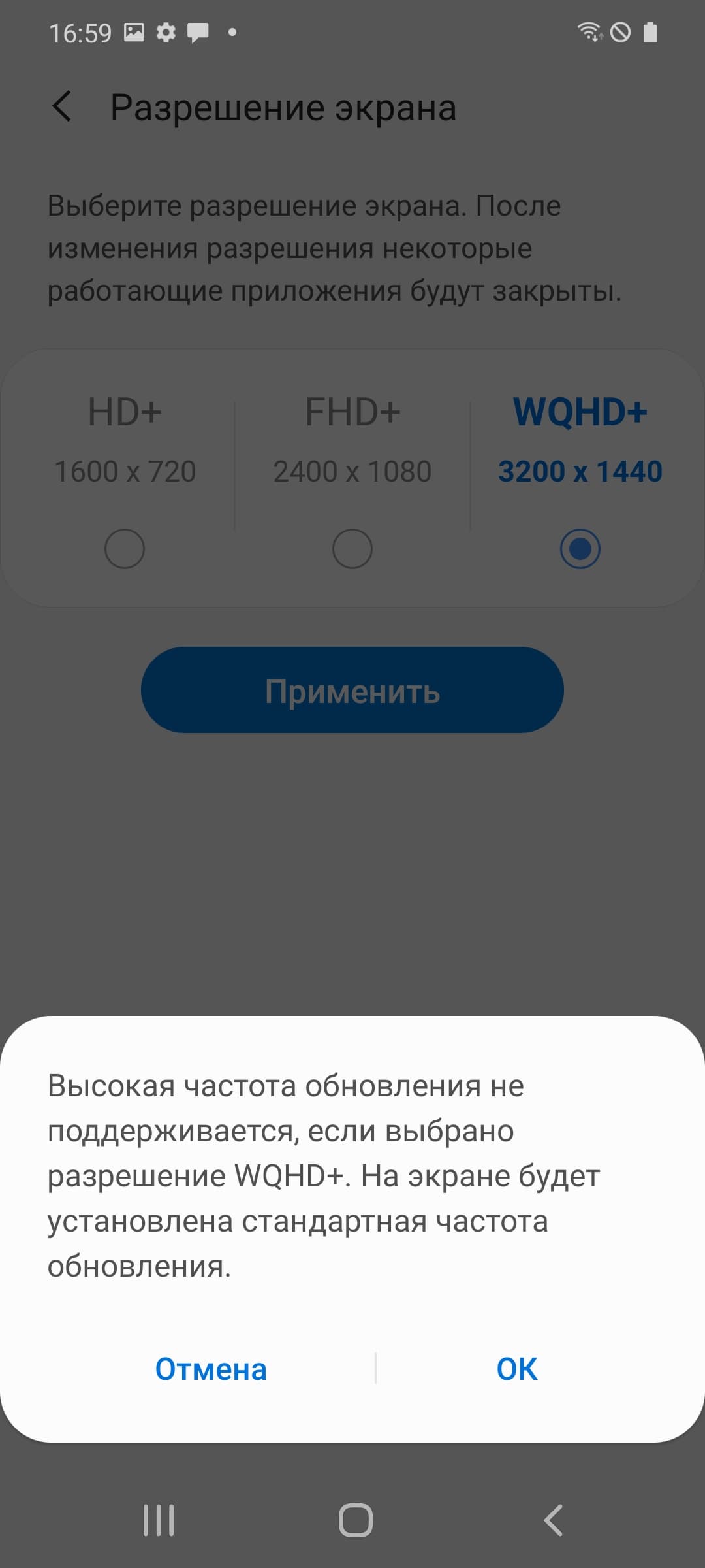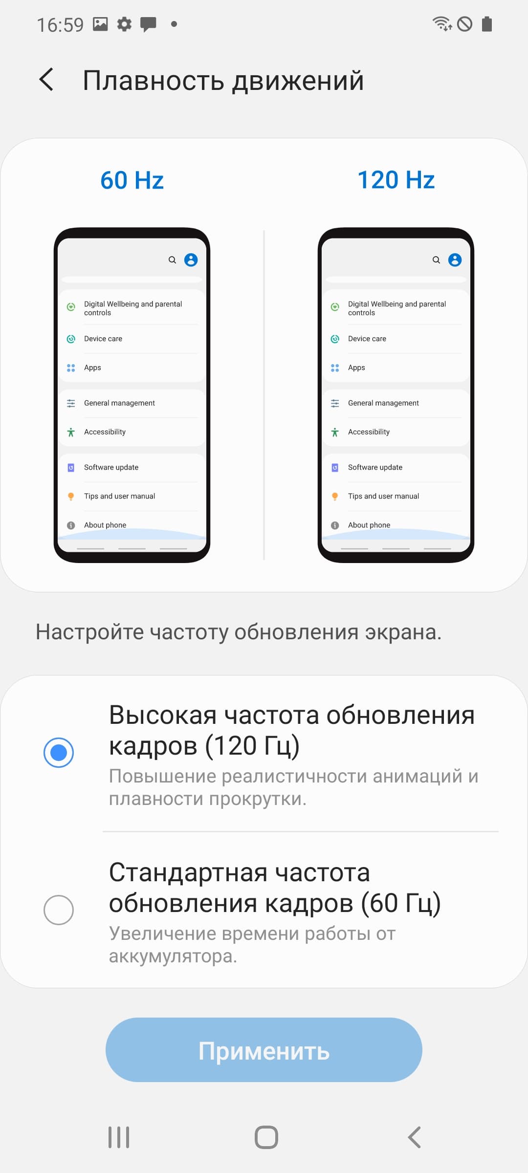 В настройках экрана можно включить режим с повышенной до 120 Гц частотой обновления. В этом режиме нам как минимум обещают увеличение плавности прокрутки, но родное разрешение при этом уже не поддерживается.