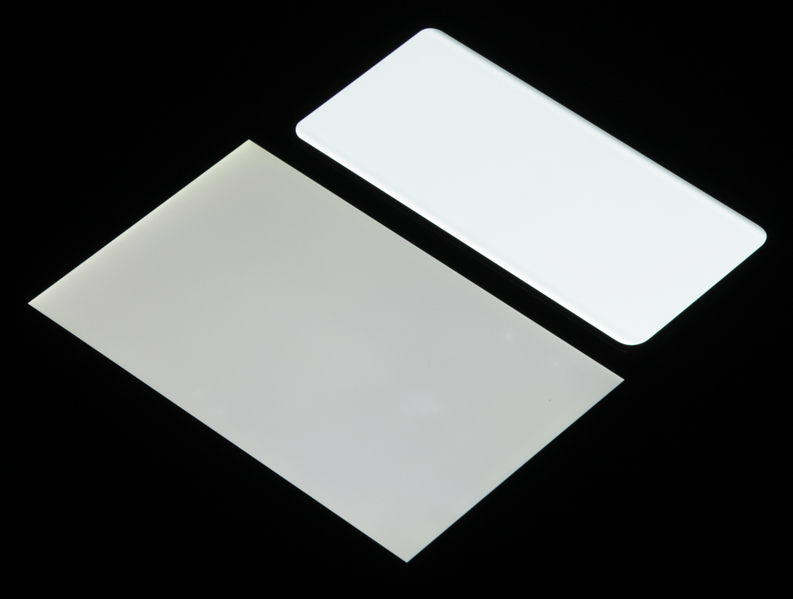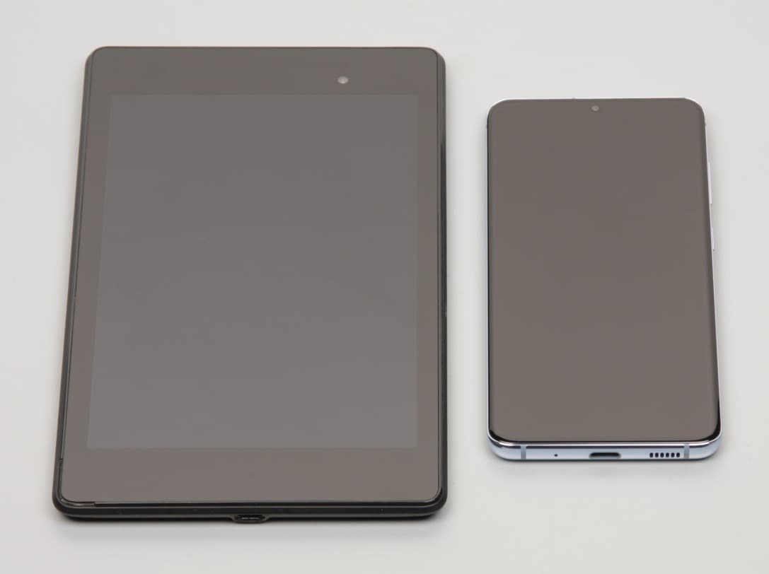 Лицевая поверхность экрана выполнена в виде стеклянной пластины с зеркально-гладкой поверхностью, устойчивой к появлению царапин. Судя по отражению объектов, антибликовые свойства экрана лучше, чем у экрана Google Nexus 7 (2013) (далее просто Nexus 7). Для наглядности приведем фотографию, на которой в выключенных экранах отражается белая поверхность (слева — Nexus 7, справа — Samsung Galaxy S20, далее их можно различать по размеру):