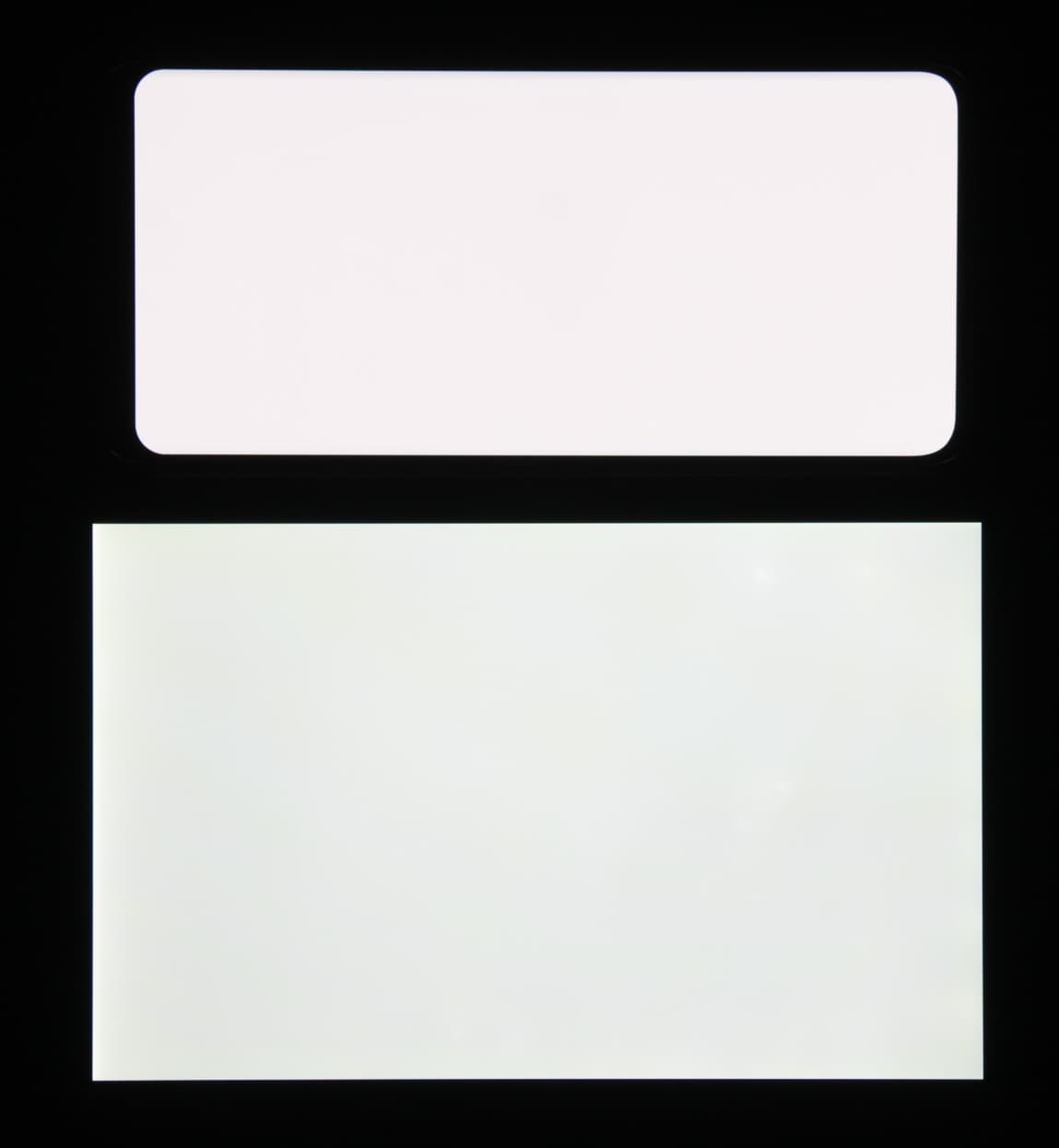 Экран характеризуется великолепными углами обзора. Правда, белый цвет при отклонении даже на небольшие углы приобретает поочередно легкий сине-зеленый или розоватый оттенок, но черный цвет остается просто черным под любыми углами. Он настолько черный, что параметр контрастности в данном случае неприменим. Для сравнения приведем фотографии, на которых на экраны Samsung Galaxy S20 (профиль Насыщенные цвета) и второго участника сравнения выведены одинаковые изображения, при этом яркость экранов по белому полю изначально установлена примерно на 200 кд/м², а цветовой баланс на фотоаппарате принудительно переключен на 6500 К.