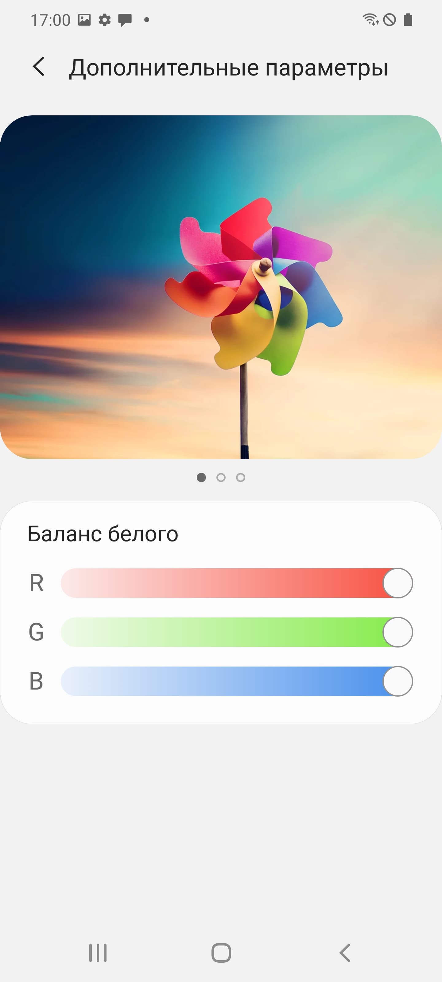Почему-то только при выборе профиля Насыщенные цвета появляется возможность настройки цветового баланса регулировкой цветовой температуры и тремя регулировками интенсивности основных цветов, но из-за слишком широкого цветового охвата как раз в этом профиле нет смысла исправлять именно баланс.