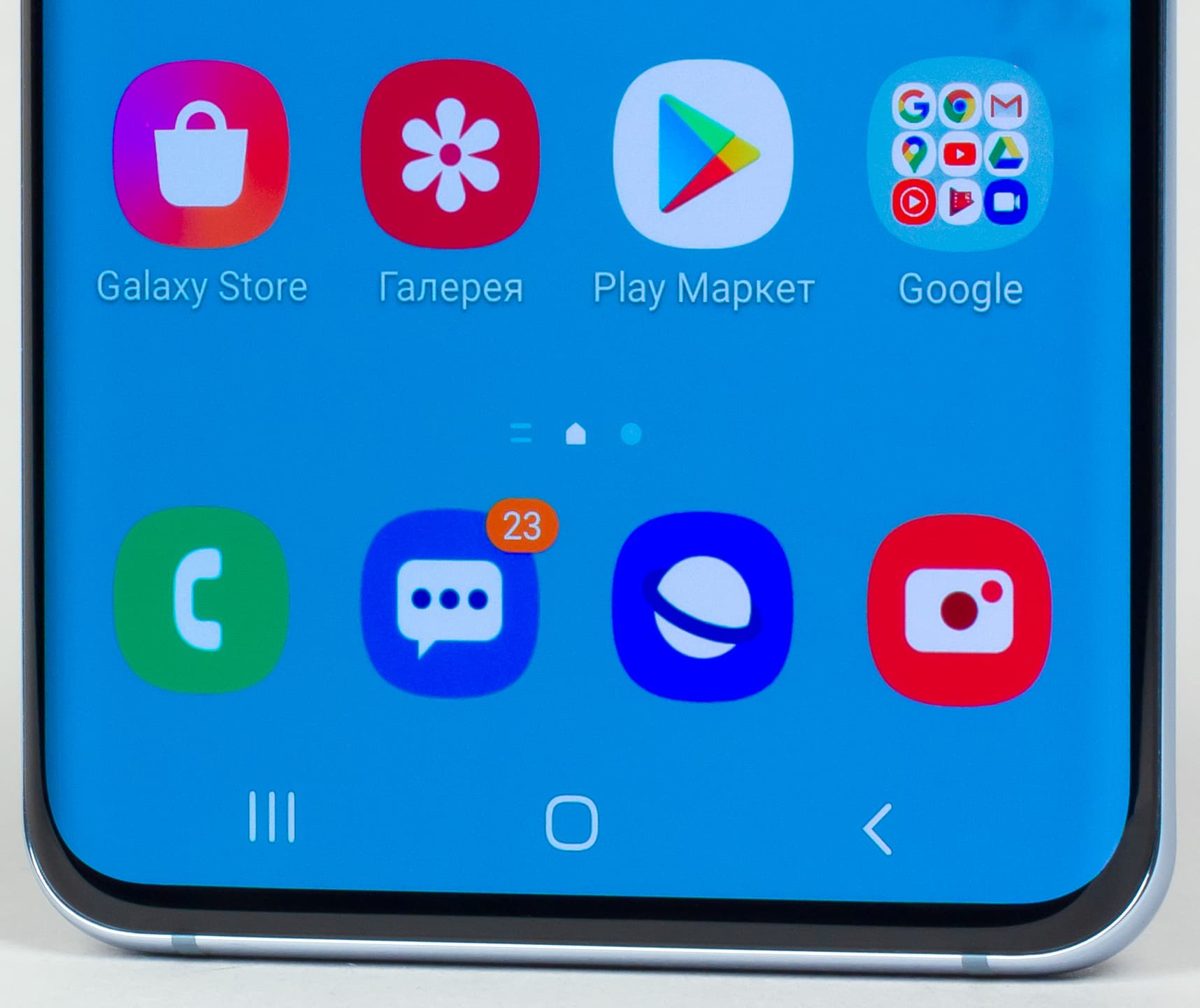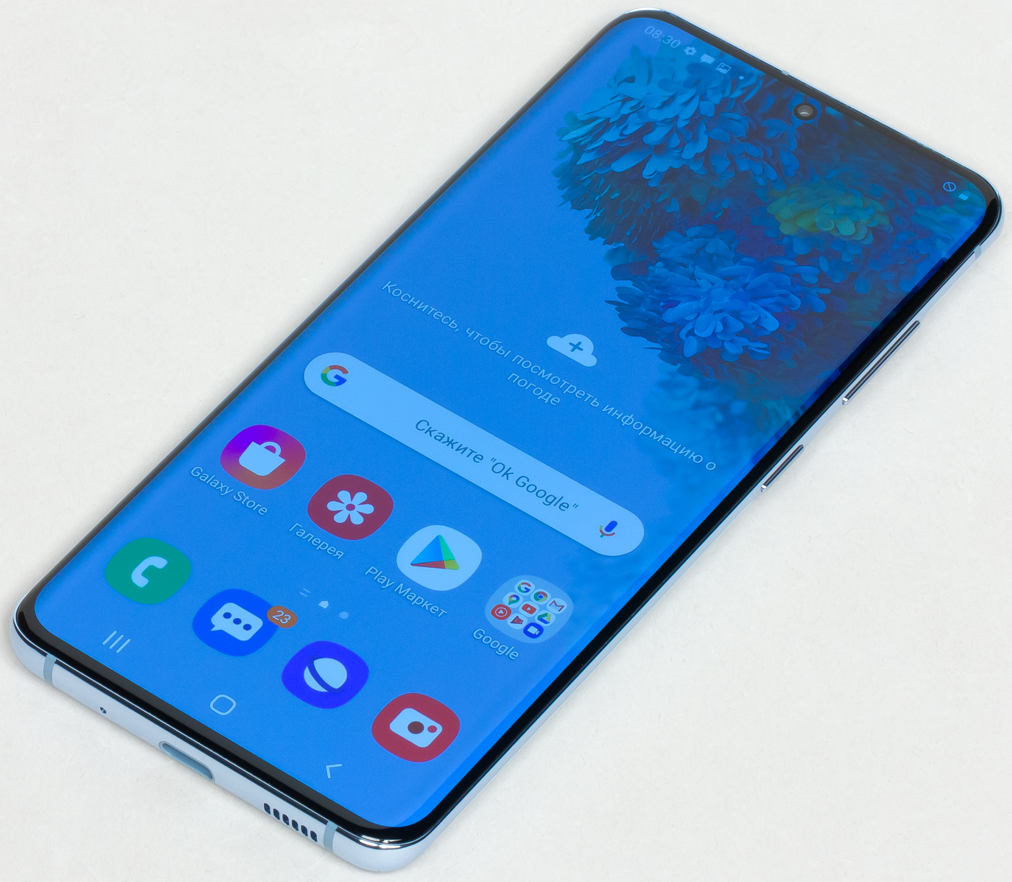 Цветопередача хорошая, цвета в меру насыщенные, цветовой баланс у экранов немного различается. Напомним, что фотография не может служить надежным источником сведений о качестве цветопередачи и приводится только для условной наглядной иллюстрации. В частности, выраженный красноватый оттенок белого и серого полей, присутствующий на фотографиях экрана Samsung Galaxy S20, при перпендикулярном взгляде визуально отсутствует, что подтверждается аппаратными тестами с помощью спектрофотометра. Причина в том, что спектральная чувствительность матрицы фотоаппарата неточно совпадает с этой характеристикой человеческого зрения. Заметим, что в данном случае картинка занимает в высоту (при ландшафтной ориентации экрана) всю доступную для вывода изображения область и заходит на загнутые края экрана, что приводит к легкому затемнению и искажению цвета. Также на свету эти области почти всегда бликуют, что еще больше мешает при просмотре изображений, выведенных на весь экран. И даже картинка фильмов с соотношением сторон 16:9 заходит на загибы, что мешает при просмотре кино. Впрочем, в данном смартфоне загнутая область имеет небольшую ширину, и отрицательные эффекты от ее присутствия небольшие.