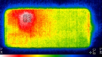 Нагрев выше в верхней части и левее центра, что, видимо, соответствует расположению микросхемы SoC. По данным теплокамеры, максимальный нагрев составил 35 градусов (при температуре окружающего воздуха в 24 градуса), это относительно немного.