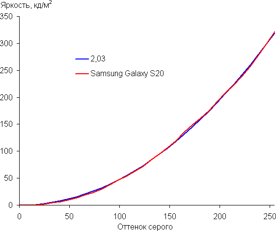 Напомним, что в случае OLED-экранов яркость фрагментов изображения динамично меняется в соответствии с характером выводимого изображения — уменьшается для светлых в целом изображений. В итоге полученная зависимость яркости от оттенка (гамма-кривая), скорее всего, немного не соответствует гамма-кривой статичного изображения, так как измерения проводились при последовательном выводе оттенков серого почти на весь экран.