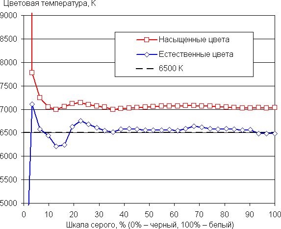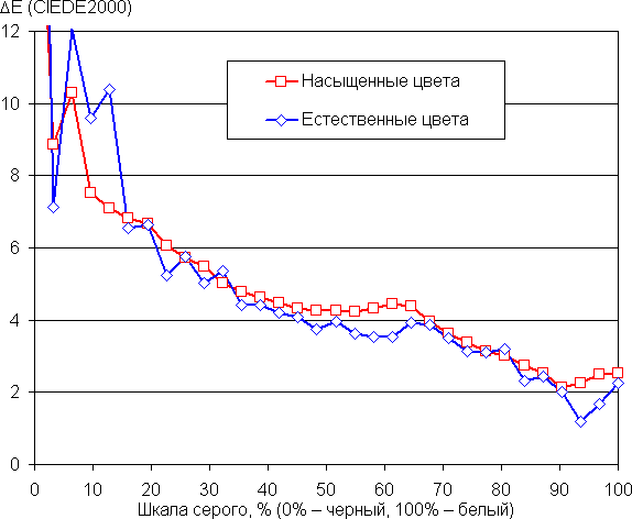 (Самые темные области шкалы серого в большинстве случаев можно не учитывать, так как там баланс цветов не имеет большого значения, да и погрешность измерений цветовых характеристик на низкой яркости большая.)
