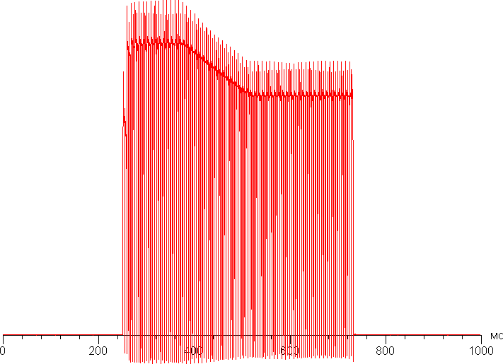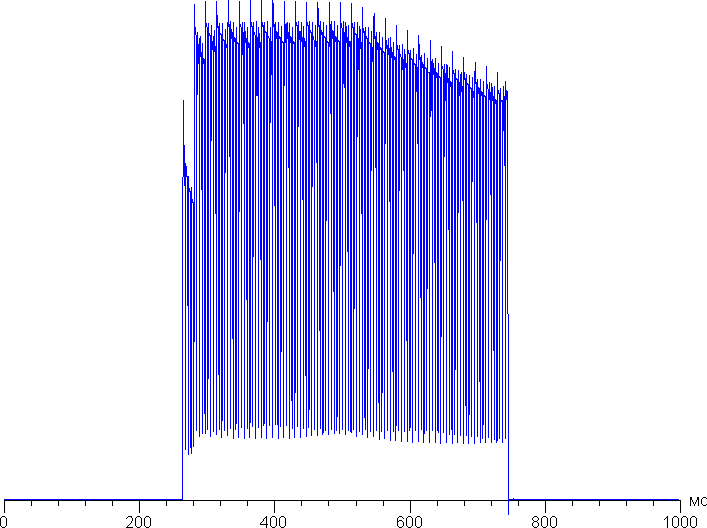 Переключение состояния элементов матрицы выполняется практически мгновенно, но на фронте включения может присутствовать ступенька шириной примерно 17 мс (в режиме с частотой обновления экрана 60 Гц). Например, так выглядит зависимость яркости от времени при переходе от черного к белому и обратно: