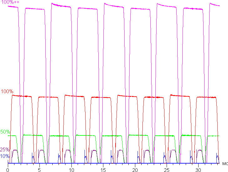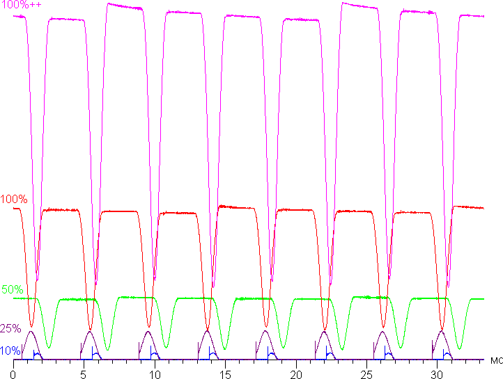 Видно, что амплитуда модуляции в этом режиме достигает 100% на любом уровне яркости, но принципиальных отличий от режима с частотой обновления 60 Гц нет.
