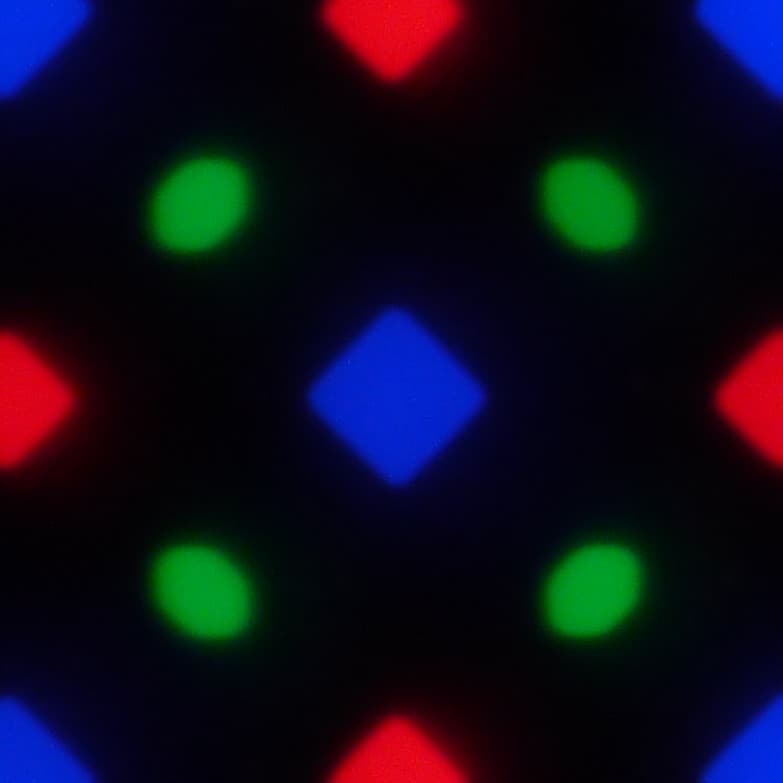 На фрагменте выше можно насчитать 4 зеленых субпикселя, 2 красных (4 половинки) и 2 синих (1 целый и 4 четвертушки), при этом, повторяя эти фрагменты, можно выложить весь экран без разрывов и перехлеста. Для таких матриц компания Samsung ввела наименование PenTile RGBG. Разрешение экрана производитель считает по зеленым субпикселям, по двум другим оно будет в два раза ниже. Присутствуют некоторая неровность контрастных границ и другие артефакты, но из-за очень высокого разрешения они лишь минимально сказываются на качестве изображения.