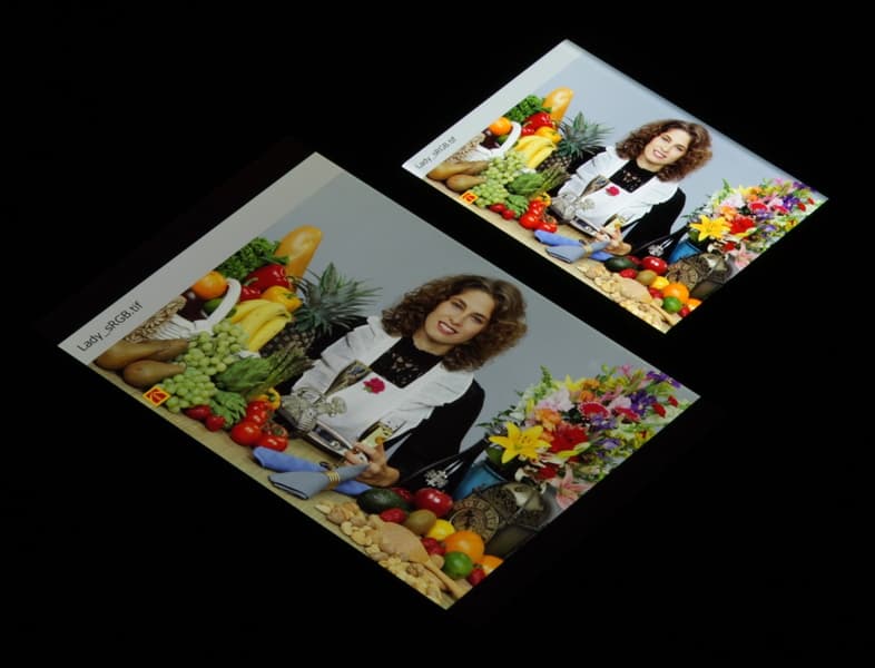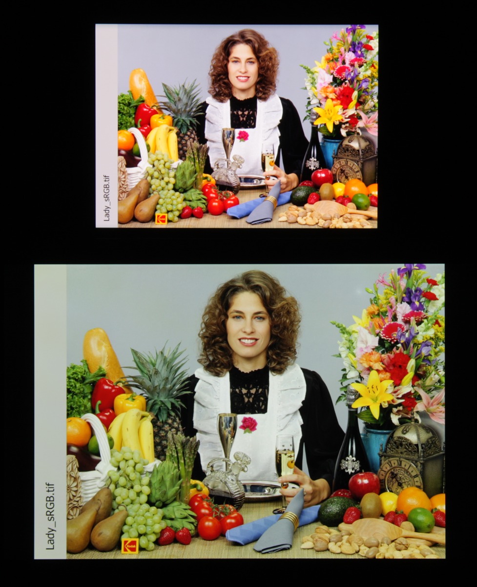 Отметим, что на экранах с широким цветовым охватом (без соответствующей коррекции) цвета́ обычных изображений, оптимизированных для устройств sRGB, выглядят неестественно насыщенными. Отсюда и рекомендация: в большинстве случаев смотреть кино, фотографии и все естественное лучше при выборе профиля Естественные цвета, и только если фотография или видеоматериал сделаны с охватом DCI, принятым в цифровом кинематографе, или Adobe RGB, то имеет смысл переключить профиль на Насыщенные цвета.