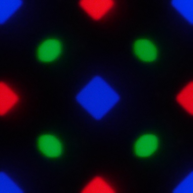 В этом экране используется матрица Super AMOLED — активная матрица на органических светодиодах. Полноцветное изображение создается с помощью субпикселей трех цветов — красного (R), зеленого (G) и синего (B), но красных и синих субпикселей в два раза меньше, что можно обозначить как RGBG. Это подтверждается фрагментом микрофотографии: