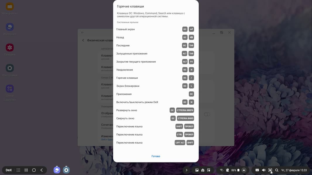 Управляющая панель в нижней части экрана убирается при выводе изображения на весь экран (например, при воспроизведении видео). Вывод на монитор осуществляется в истинном разрешении 1920 на 1080 пикселей и точка в точку. Отметим, что одновременно с выводом изображения и звука можно по USB или по Bluetooth подключать к смартфону мышь и клавиатуру, превращая его в основу для рабочего места. Кроме того, читаются подключенные к адаптеру USB-накопители и карты памяти. Для физической клавиатуры поддерживаются переключение языка и ряд горячих сочетаний клавиш (клавиша OC — это клавиша Win на клавиатуре ПК).