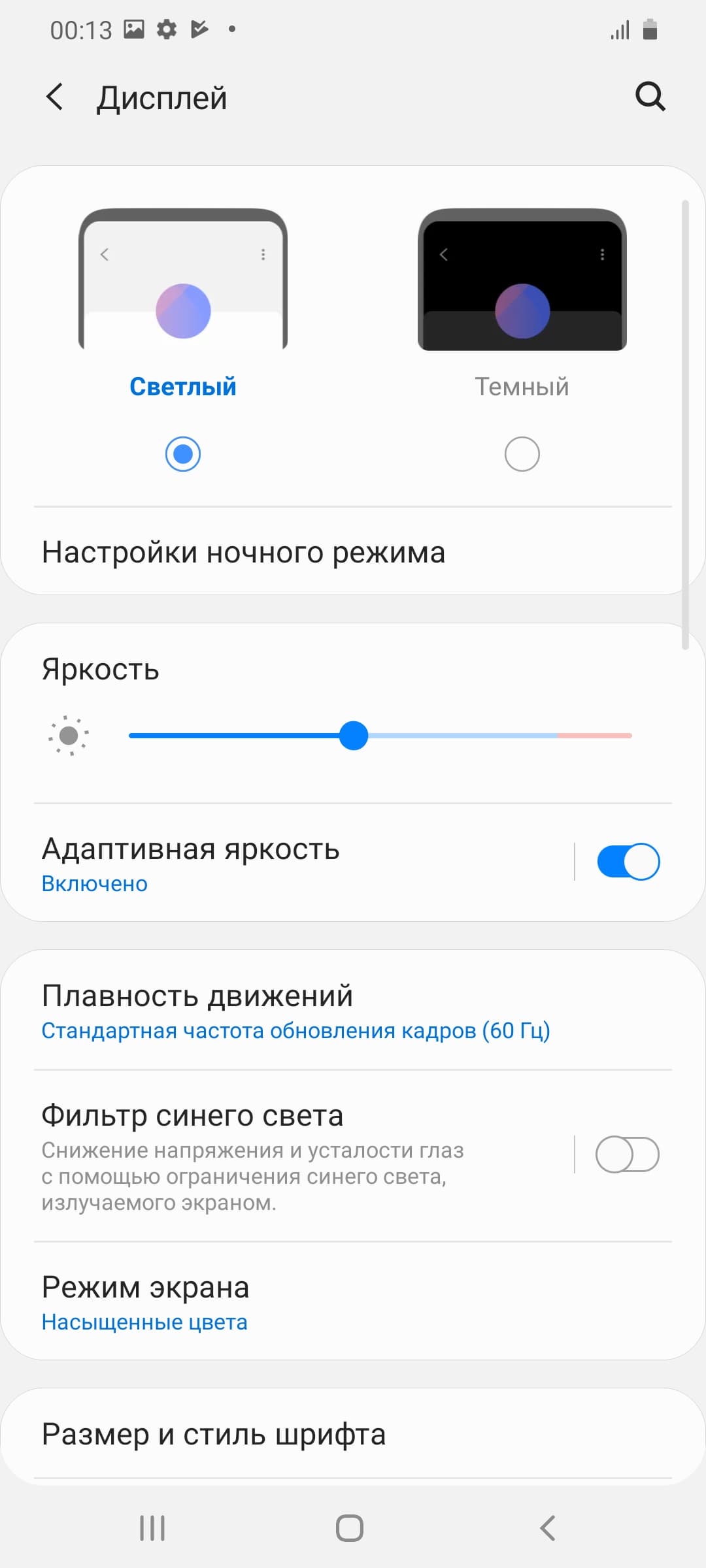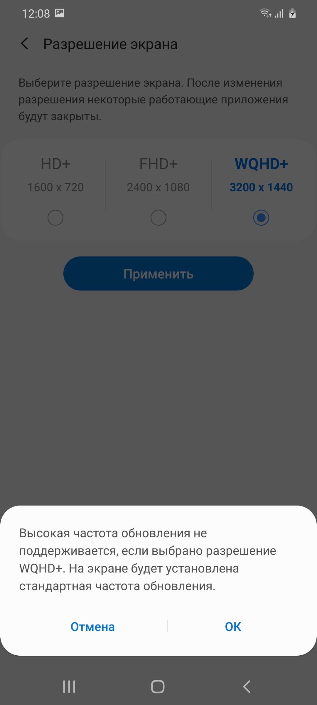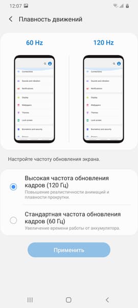 В настройках экрана можно включить режим с повышенной до 120 Гц частотой обновления. В этом режиме нам как минимум обещают увеличение плавности прокрутки, но родное разрешение при этом уже не поддерживается.