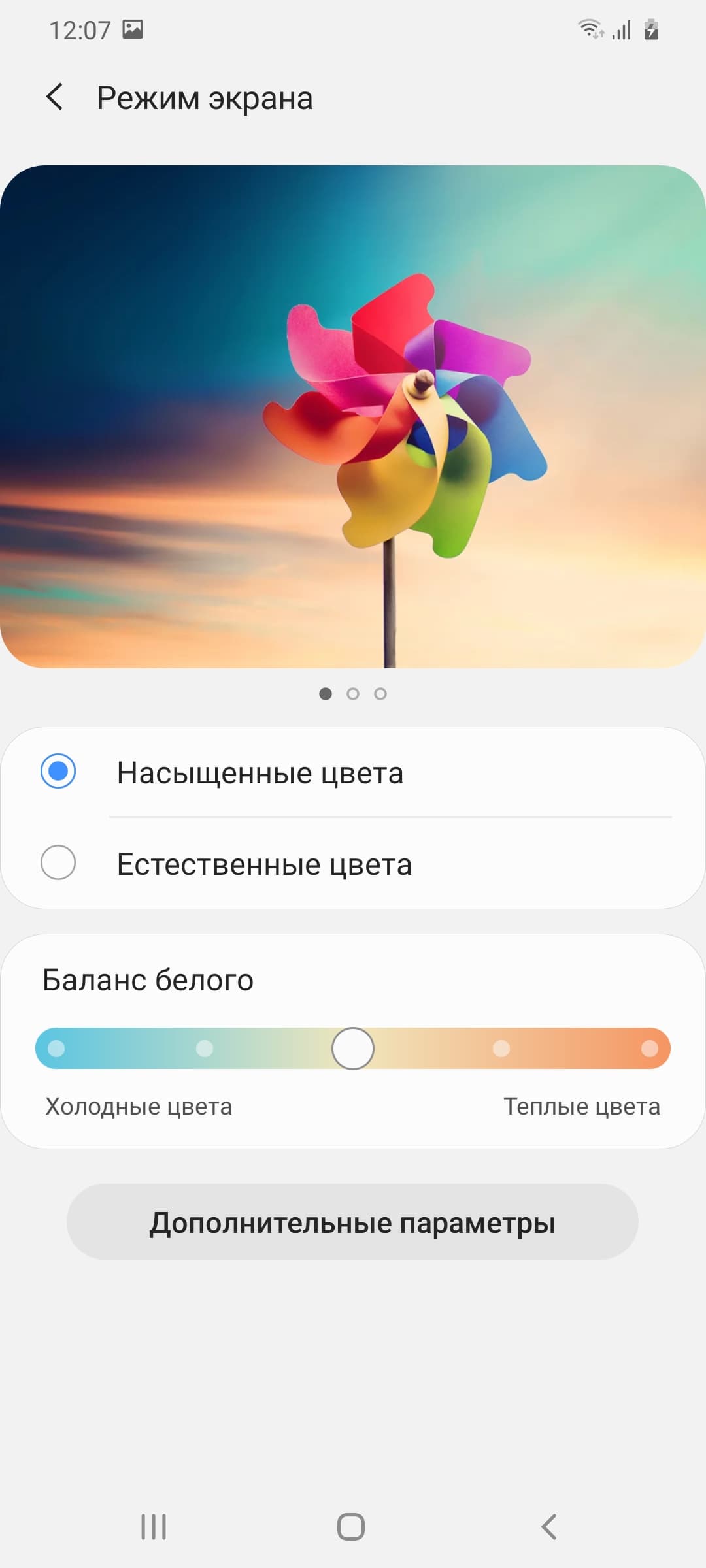 Почему-то только при выборе профиля Насыщенные цвета появляется возможность настройки цветового баланса регулировкой цветовой температуры и тремя регулировками интенсивности основных цветов, но из-за слишком широкого цветового охвата как раз в этом профиле нет смысла исправлять именно баланс.