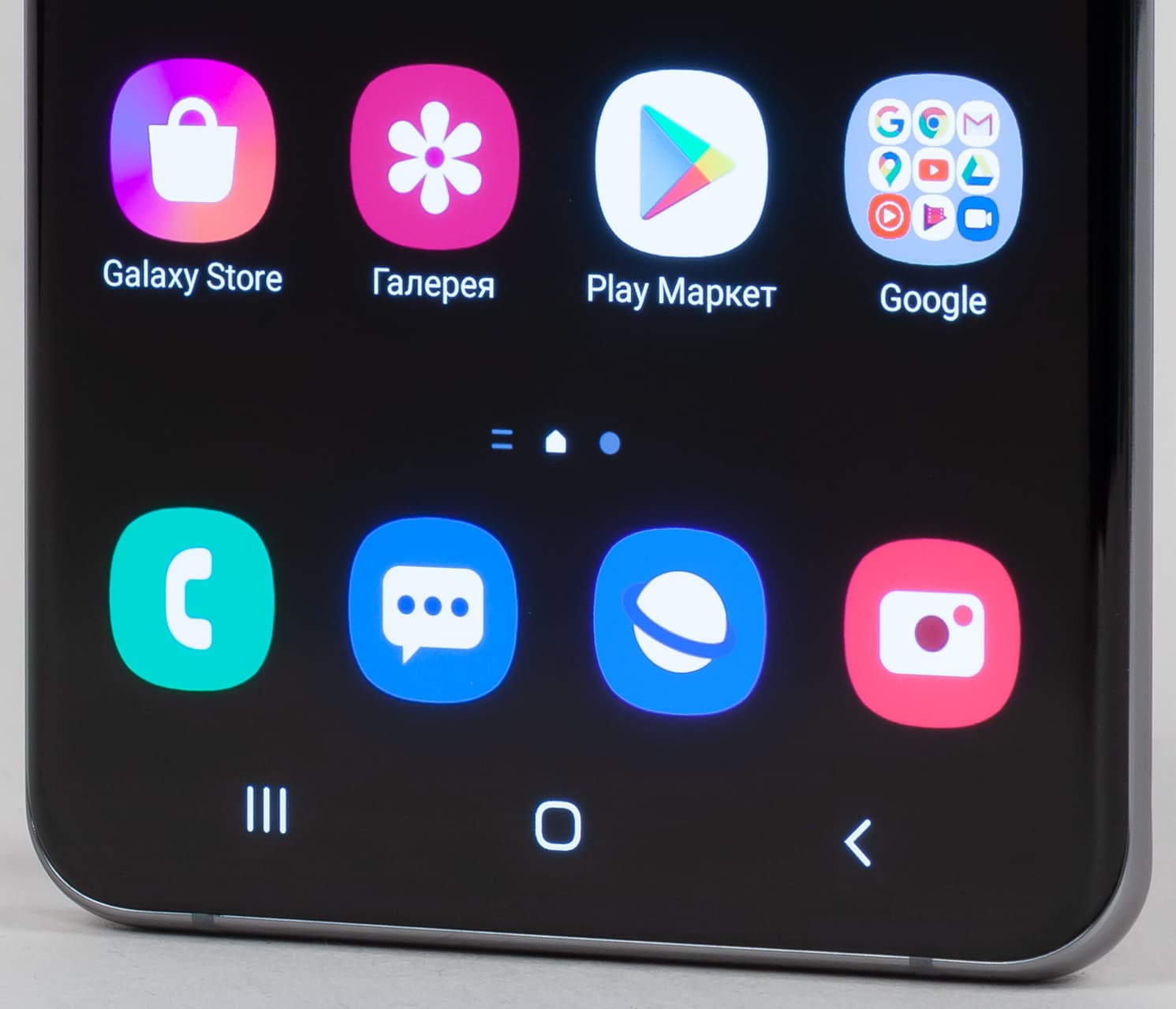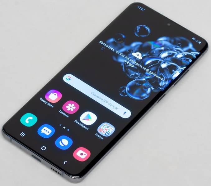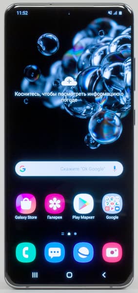Цветопередача хорошая, цвета в меру насыщенные, цветовой баланс у экранов немного различается. Напомним, что фотография не может служить надежным источником сведений о качестве цветопередачи и приводится только для условной наглядной иллюстрации. В частности, выраженный красноватый оттенок белого и серого полей, присутствующий на фотографиях экрана Samsung Galaxy S20 Ultra 5G, при перпендикулярном взгляде визуально отсутствует, что подтверждается аппаратными тестами с помощью спектрофотометра. Причина в том, что спектральная чувствительность матрицы фотоаппарата неточно совпадает с этой характеристикой человеческого зрения. Заметим, что в данном случае картинка занимает в высоту (при ландшафтной ориентации экрана) всю доступную для вывода изображения область и заходит на загнутые края экрана, что приводит к легкому затемнению и искажению цвета. Также на свету эти области почти всегда бликуют, что еще больше мешает при просмотре изображений, выведенных на весь экран. И даже картинка фильмов с соотношением сторон 16:9 заходит на загибы, что мешает при просмотре кино. Впрочем, в данном смартфоне загнутая область имеет небольшую ширину, и отрицательные эффекты от ее присутствия небольшие. Непонятно, зачем вообще оставили эти загибы — видимо, здравый смысл еще не до конца перевесил склонность к дизайнерским изыскам.