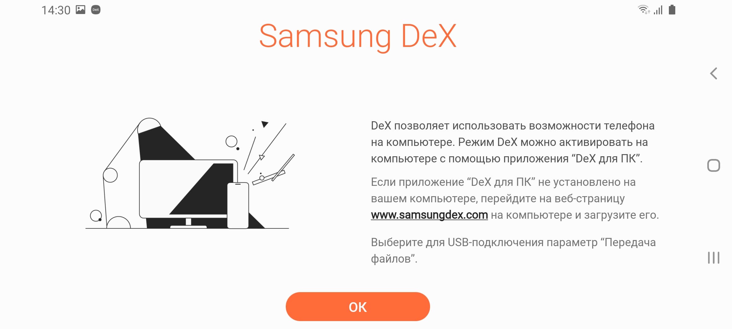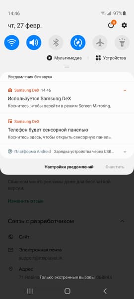 По всей видимости, также поддерживается работа в режиме DeX просто при подключении к ПК по USB без использования адаптеров, но нужное для этого приложение загрузить не удалось.
