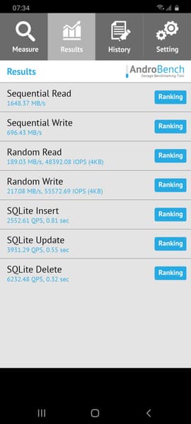 Результаты теста AndroBench на скорость работы с памятью:
