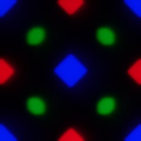 На фрагменте выше можно насчитать 4 зеленых субпикселя, 2 красных (4 половинки) и 2 синих (1 целый и 4 четвертушки), при этом, повторяя эти фрагменты, можно выложить весь экран без разрывов и перехлеста. Для таких матриц компания Samsung ввела наименование PenTile RGBG. Разрешение экрана производитель считает по зеленым субпикселям, по двум другим оно будет в два раза ниже. Присутствуют некоторая неровность контрастных границ и другие артефакты, но из-за очень высокого разрешения они лишь минимально сказываются на качестве изображения.