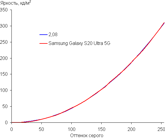 Напомним, что в случае OLED-экранов яркость фрагментов изображения динамично меняется в соответствии с характером выводимого изображения — уменьшается для светлых в целом изображений. В итоге полученная зависимость яркости от оттенка (гамма-кривая), скорее всего, немного не соответствует гамма-кривой статичного изображения, так как измерения проводились при последовательном выводе оттенков серого почти на весь экран.