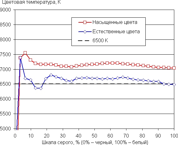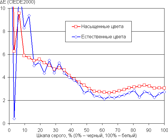 Баланс оттенков на шкале серого хороший. Цветовая температура, особенно после выбора профиля Естественные цвета близка к 6500 К, при этом на значимом участке шкалы серого этот параметр изменяется не очень сильно, что улучшает визуальное восприятие баланса цветов. Отклонение от спектра абсолютно черного тела (ΔE) на большей части шкалы серого остается ниже 10 единиц, что для потребительского устройства считается хорошим показателем, и разброс этой характеристики также небольшой: