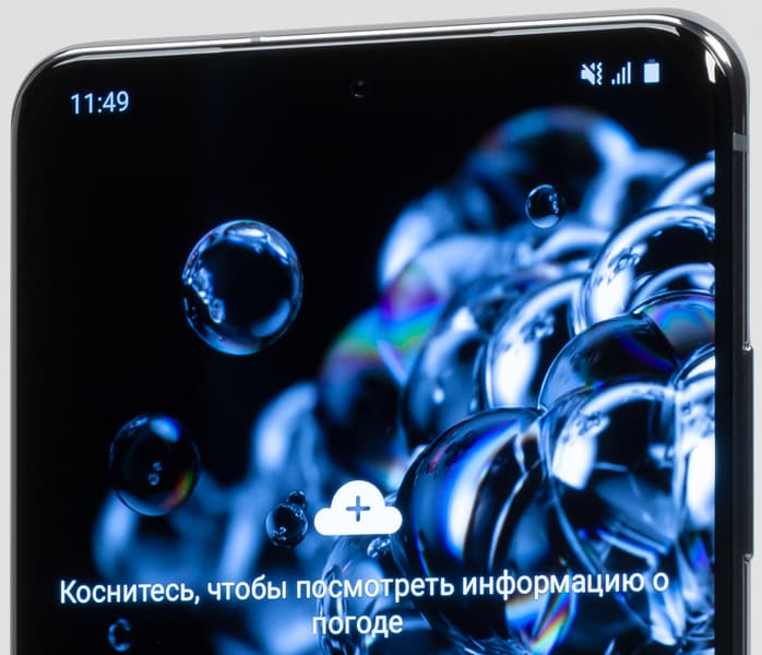 Смартфон Samsung Galaxy S20 Ultra 5G оснащен AMOLED-дисплеем (Dynamic AMOLED 2X) с диагональю 6,9 дюйма и разрешением 3200×1440, прикрытым стеклом Corning Gorilla Glass 6. Физические размеры экрана составляют 71×155 мм, соотношение сторон — 20:9, плотность точек — 511 ppi. Ширина рамки вокруг экрана составляет менее 2 мм с боков, 3 мм сверху и 4 мм снизу. Рамка действительно минимальная. Для экрана поддерживается частота обновления 120 Гц, но не для QHD-разрешения. То есть либо 120 Гц при Full HD, либо 60 Гц при Quad HD.