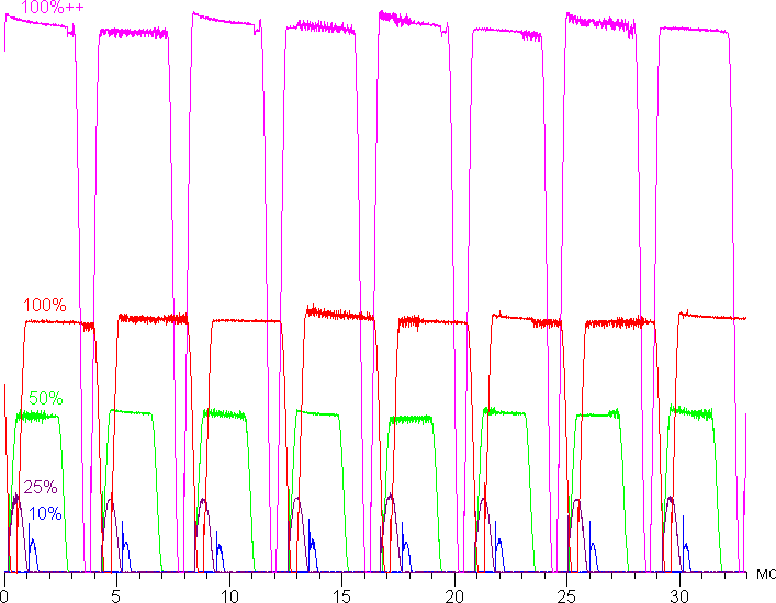 Видно, что амплитуда модуляции в этом режиме достигает 100% на любом уровне яркости, но принципиальных отличий от режима с частотой обновления 60 Гц нет.
