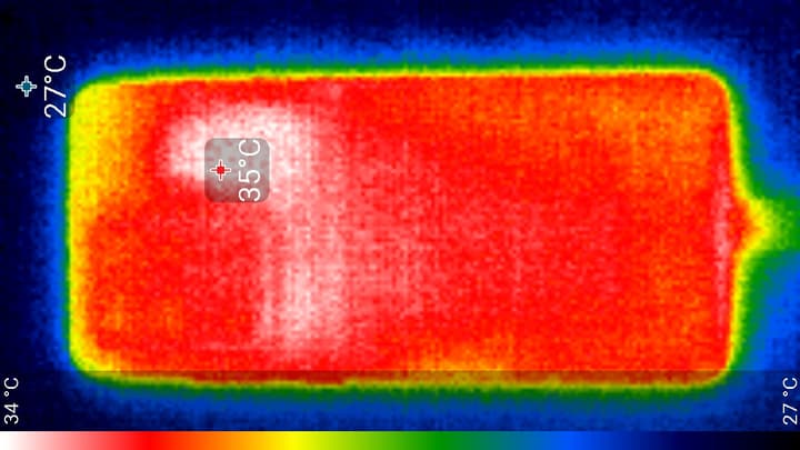 Нагрев немного выше в верхней части левее центра, что, видимо, соответствует расположению микросхемы SoC, но вообще температура крышки почти одинаковая по всей поверхности, то есть явно используется какой-то радиатор. По данным теплокамеры, максимальный нагрев составил 35 градусов (при температуре окружающего воздуха в 24 градуса), это относительно немного.
